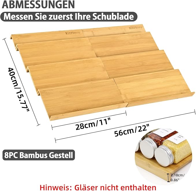 - Perfect Size: Spice rack organizer for drawer MIN size: 22" wide x 15.8" deep x 2.75" high, standard 4 oz spice jars fit easily into the drawer sliding and closing completely.please measure your drawer before ordering!