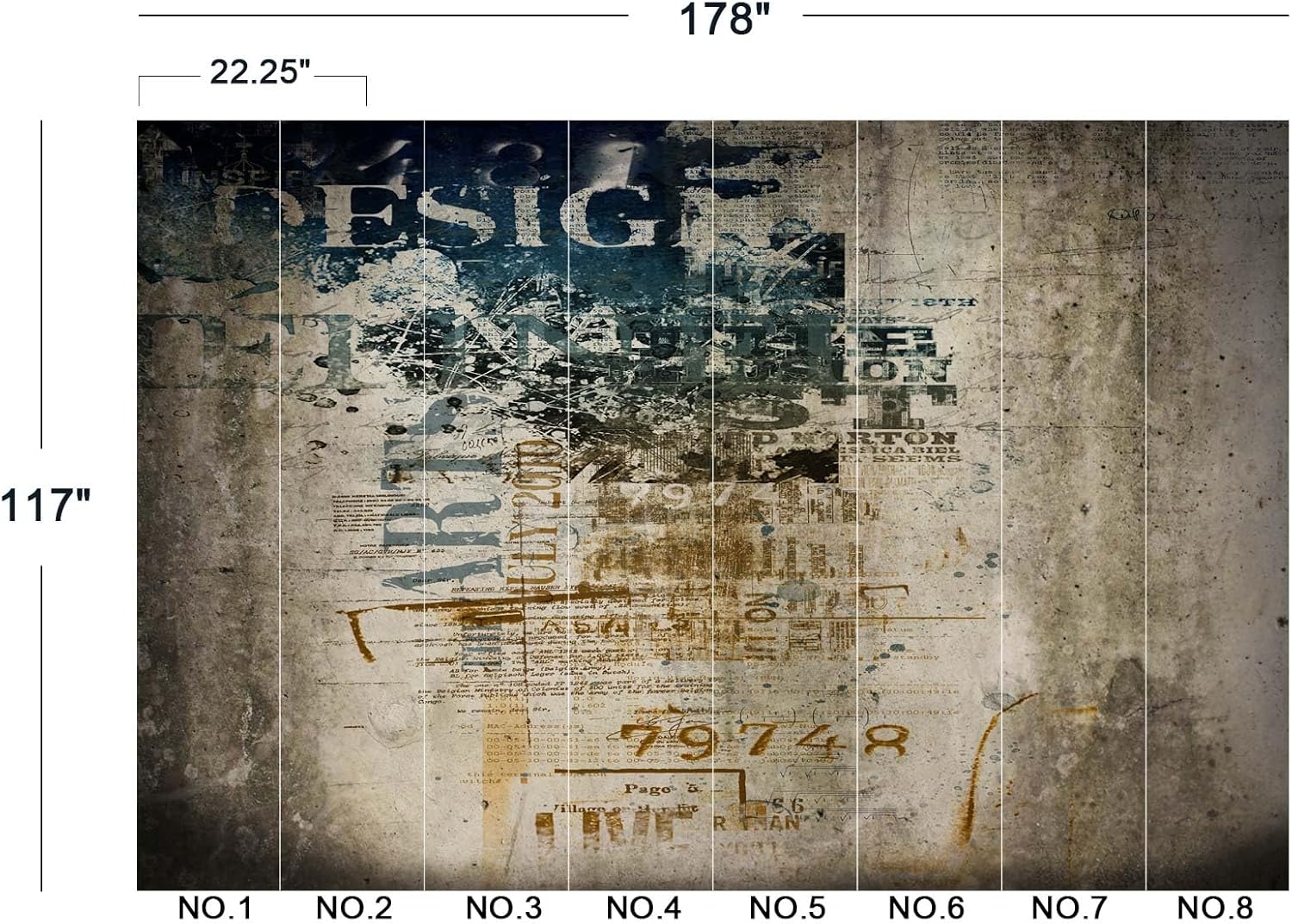 - The size of the wallpaper is 178" wide x 117" high and divided into 8 panels.