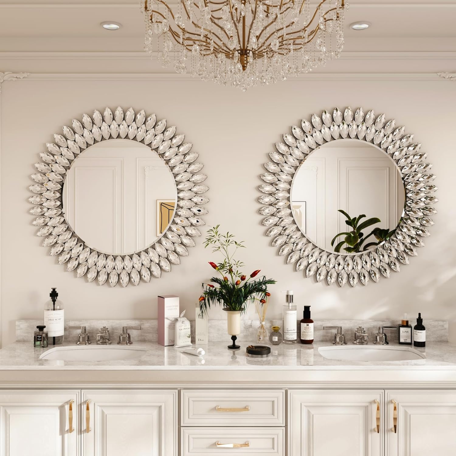 Kelly Miller Round Jeweled Mirror for Wall Decor, 26 in Modern Decorative Wall Mirror with Luxury Diamonds Beveled Vanity Mirror for Bedroom Dresser, Living Room Table, Bathroom, Hallway, Entryway