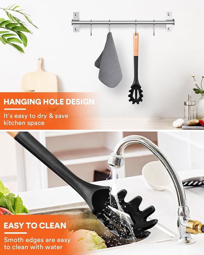 Silicone Pasta Fork, Kitchen Heat Resistant Noodle Spoon Server, BPA Free Spaghetti Strainer,12.8 inch (Black)