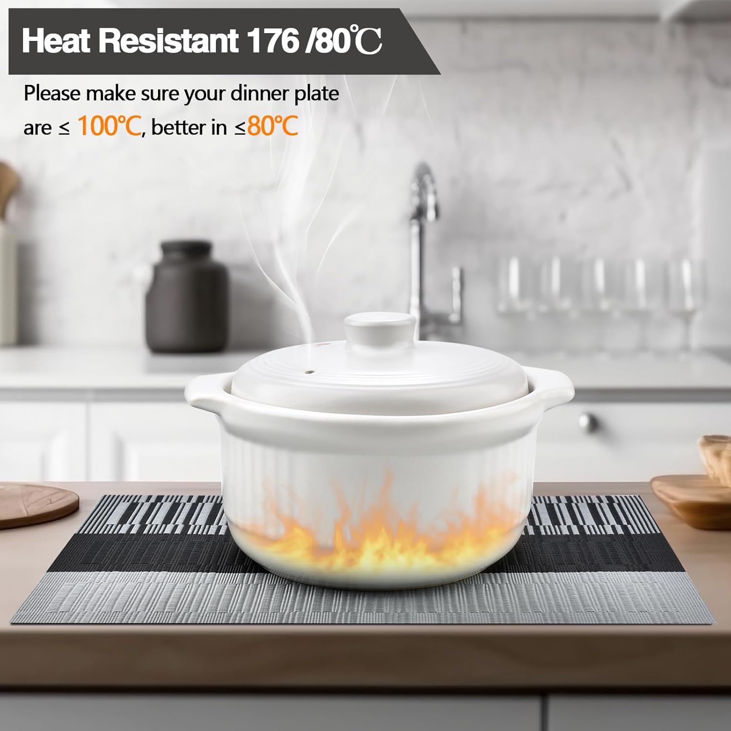 - Heat Resistant: Please make sure your dinner plate are β€ 100β, better in β€80β. It can prevent the table from slipping and scalding the countertop. These beautiful stylish vinyl place mats to add more fun to your dining table