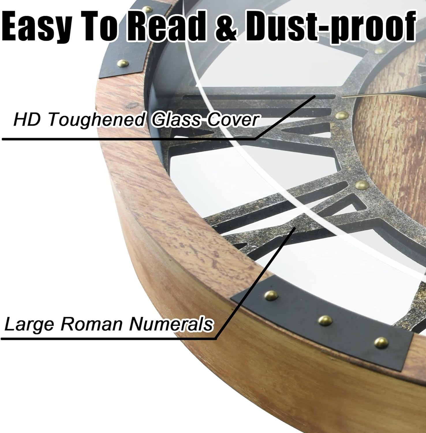 - 🧭【Oversized Clock and Silent Movement】 This giant rustic wall clock measures 30" (76CM) in diameter, 3.15'' (8CM) in depth, weight-12.56lbs (5.7kg), huge size and heavy duty. Using high quality quartz movement material to run smoothly, ensuring accurate timing and absolute silence. Big Roman Numerals, HT toughened glass cover, you can easily read the time from any angle.