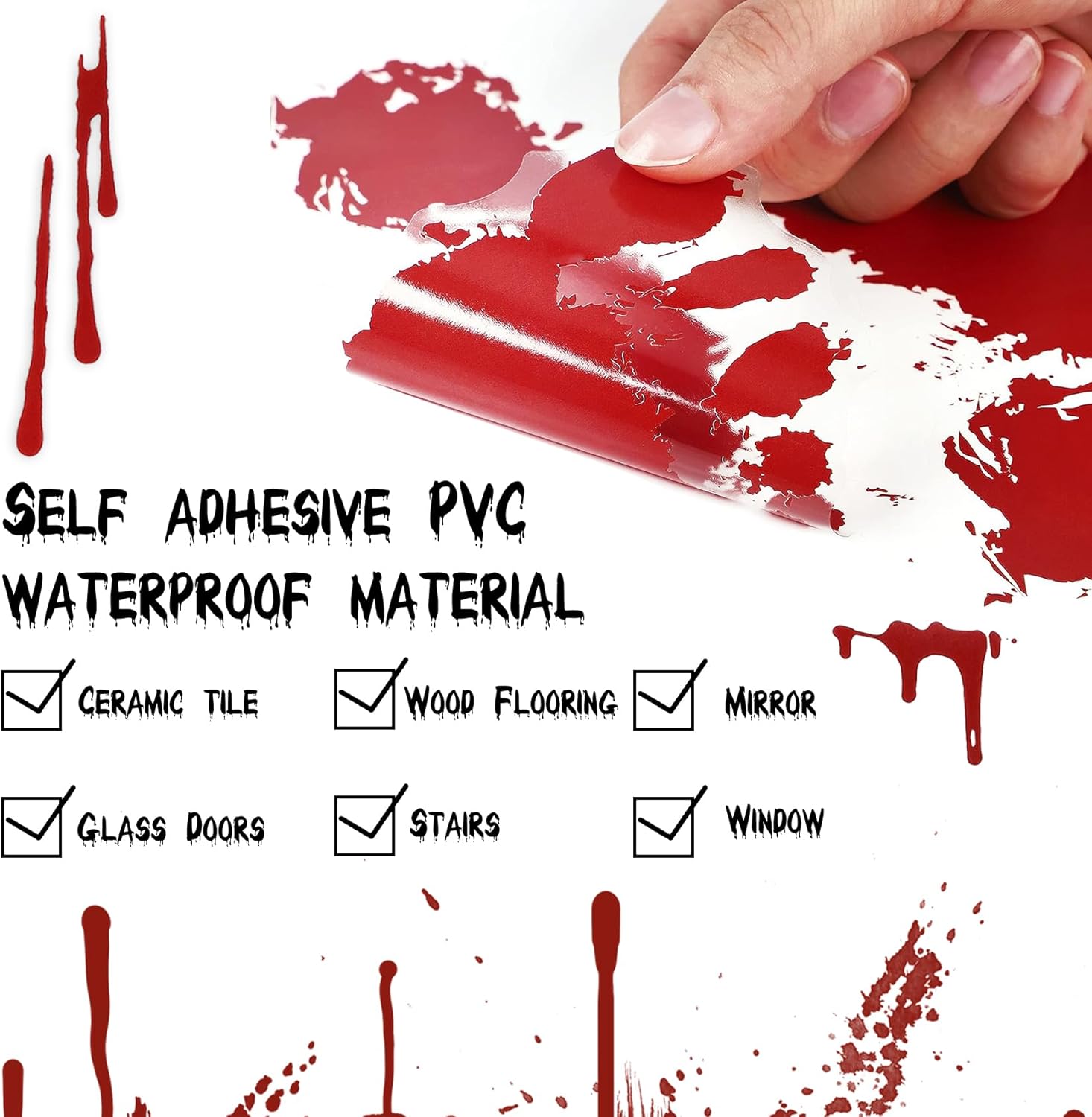- Premium Quality: DC-BEAUTIFUL Bloody Halloween Window Decoration stickers are made of premium PVC and traceless adhesive, easy to apply on and peel off. Waterproof feature of our Halloween clings allows applying outdoor as long as the surface is dry and smooth.