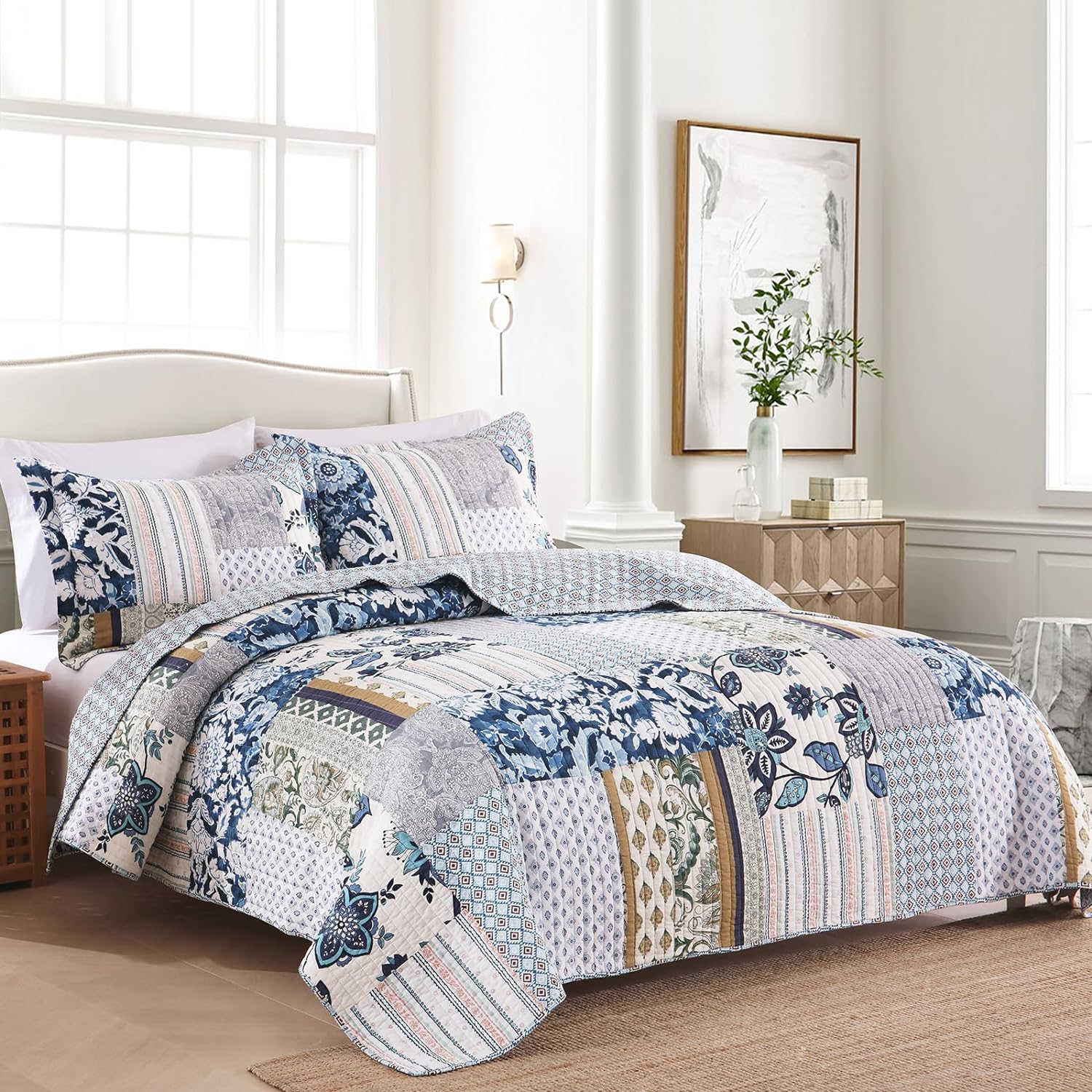 - UNIQUE QUILT SET: The real patchwork quilt set is made of different patterns pieces sewn together. Its A side is designed with paisley floral patchwork and its B side with bohemian diamond. The special design fits for any decoration and will brighten your room.