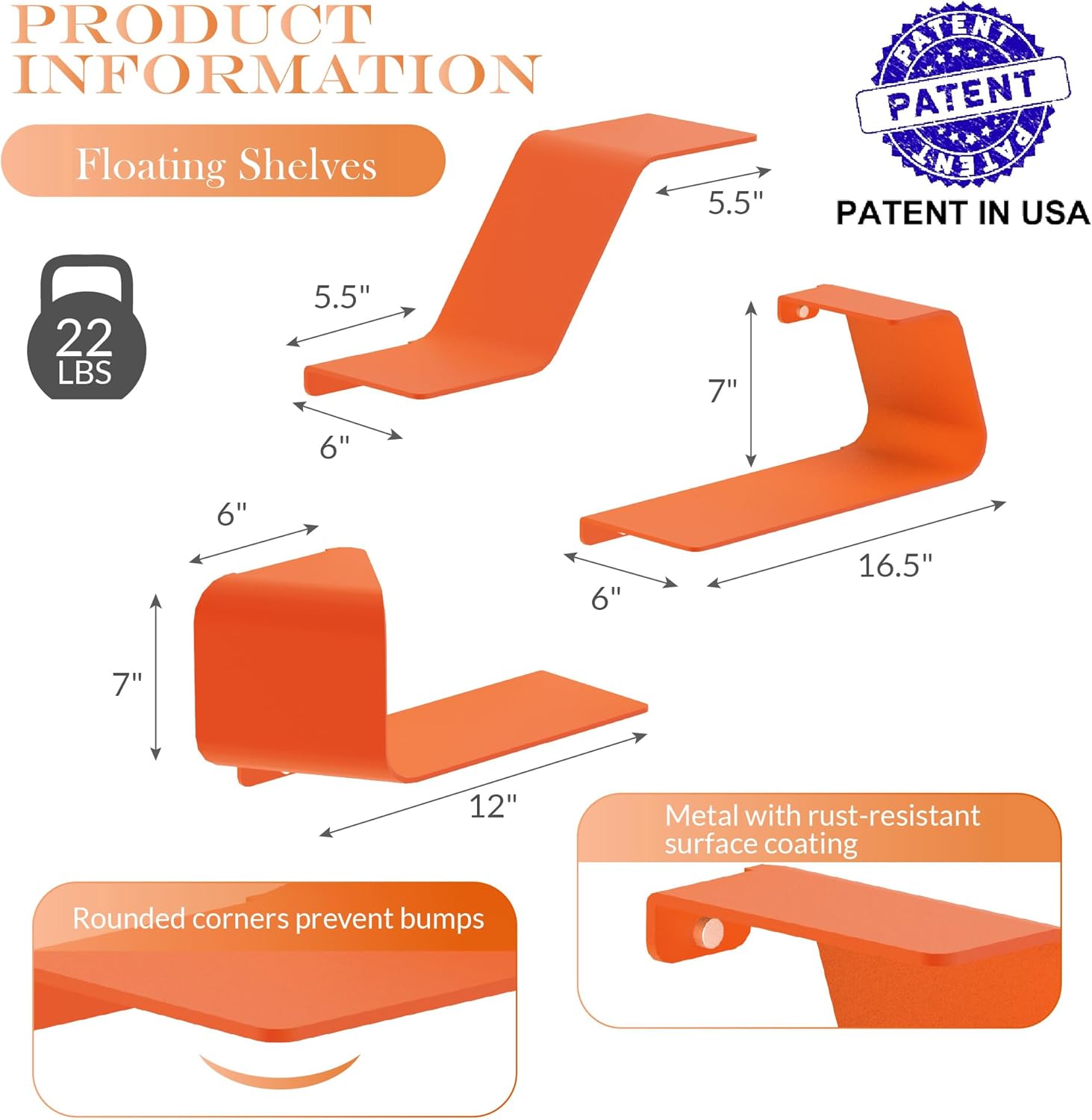 Floating Shelves, Wall Shelf, Set of 3 Wall Mounted Metal Shelves with Unique Design for Wall Storage, Book Shelf, Display Shelves for Bathroom Bedroom Kitchen Living Room for Home Orange