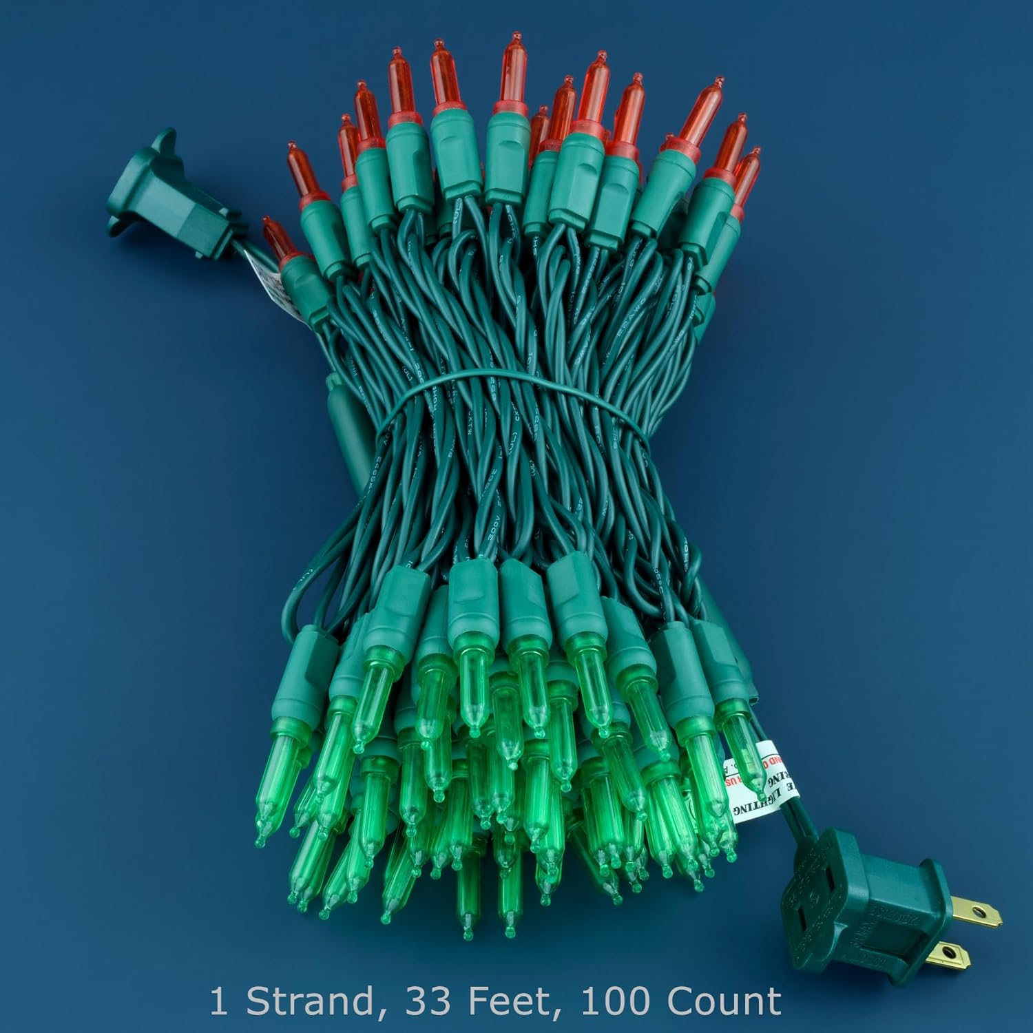 - SPECIFICATIONS β Each pack contains 1 strands of one-piece string lights, total length 33 feet with 100 count red-green interval mini lights. 22 AWG green cord, 4" lead, 4" spacing, 4" tail.