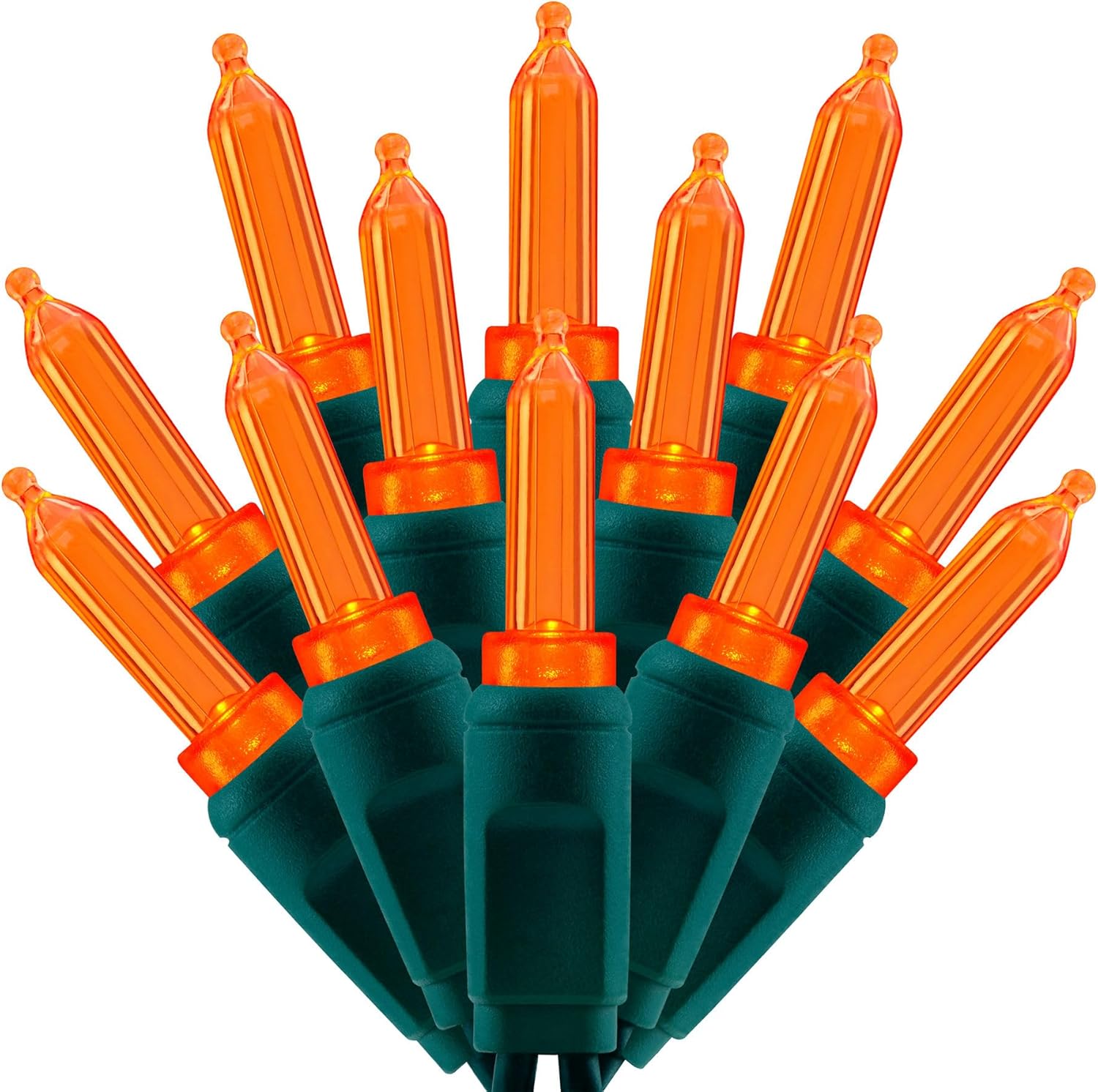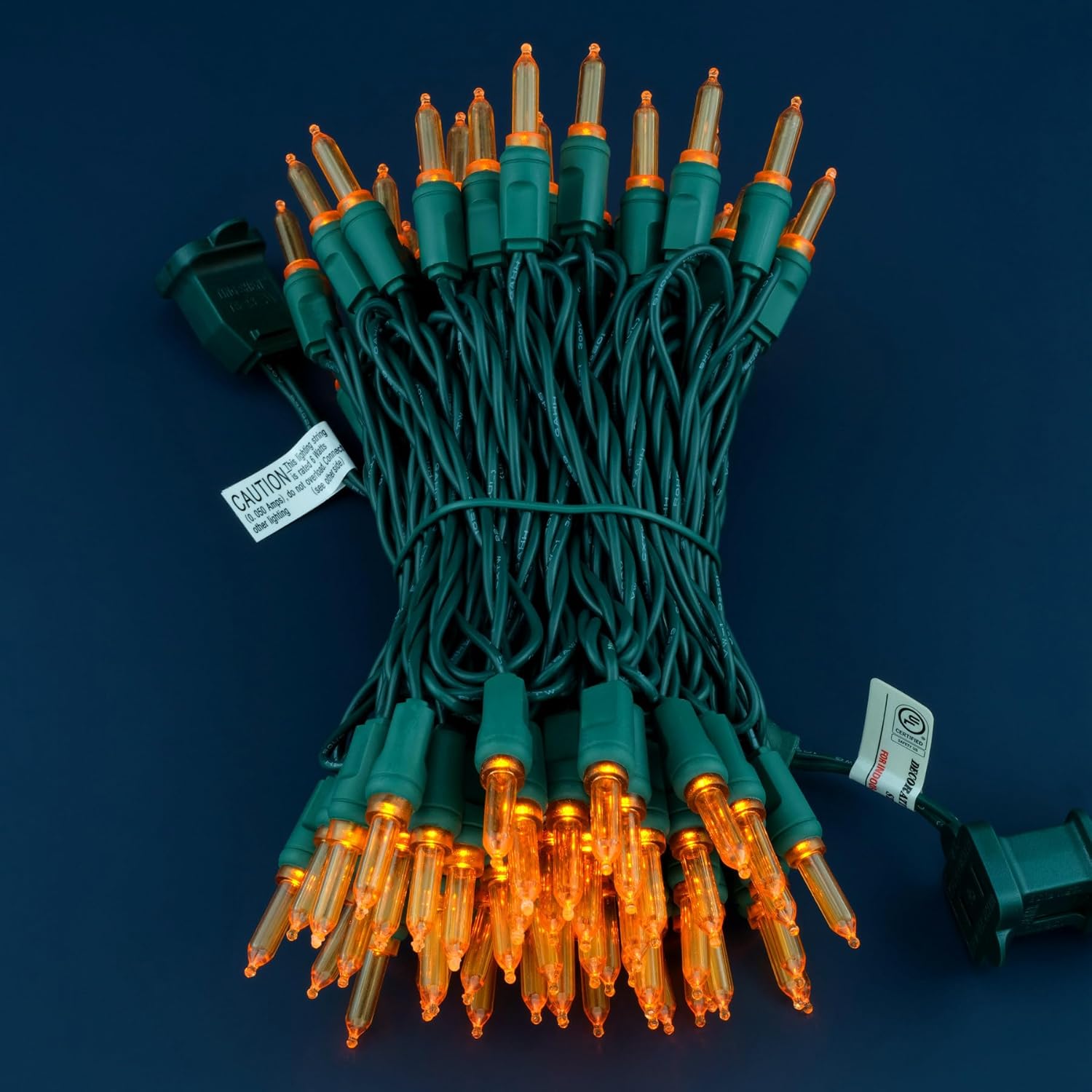 - SPECIFICATIONS β Each pack contains 1 strands of one-piece string lights, total length 33 feet with 100 count orange mini lights. 22 AWG green cord, 4" lead, 4" spacing, 4" tail.