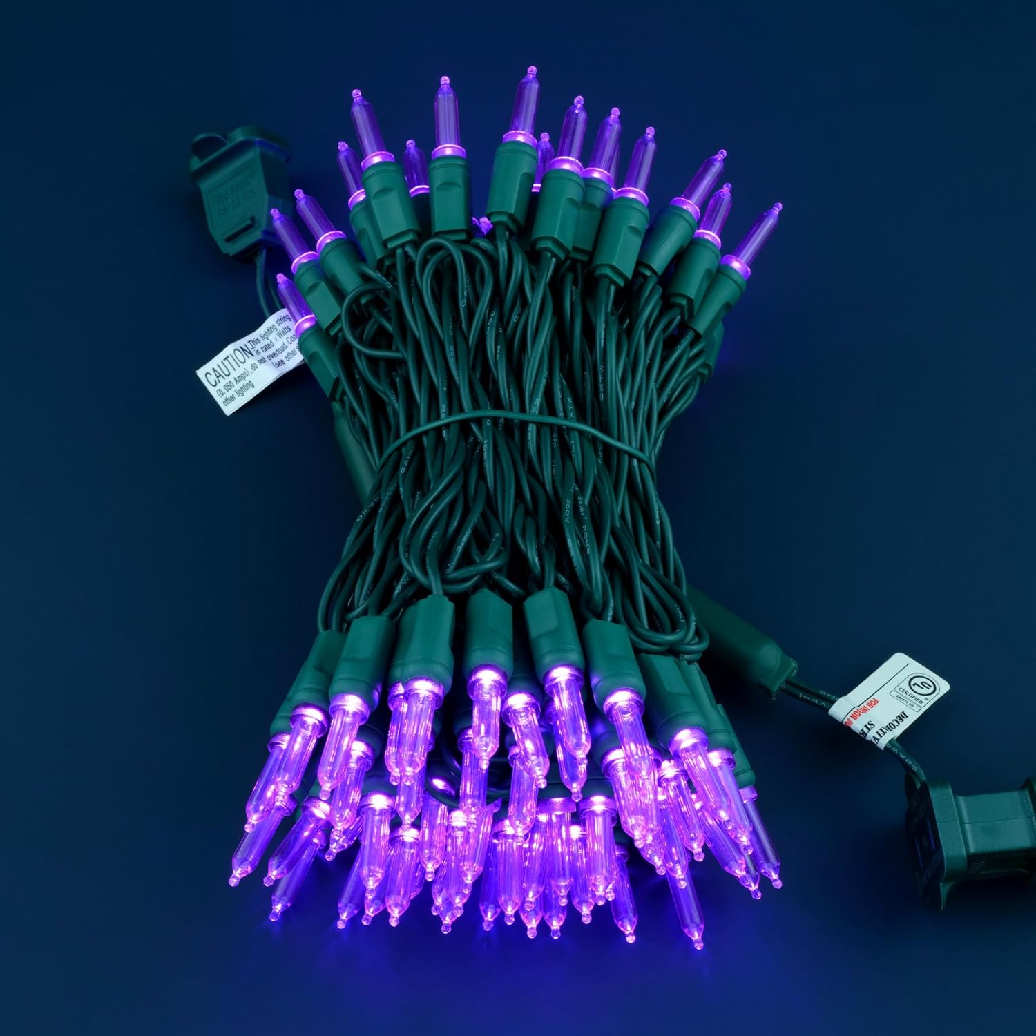 - SPECIFICATIONS β Each pack contains 1 strands of one-piece string lights, total length 33 feet with 100 count purple mini lights. 22 AWG green cord, 4" lead, 4" spacing, 4" tail.