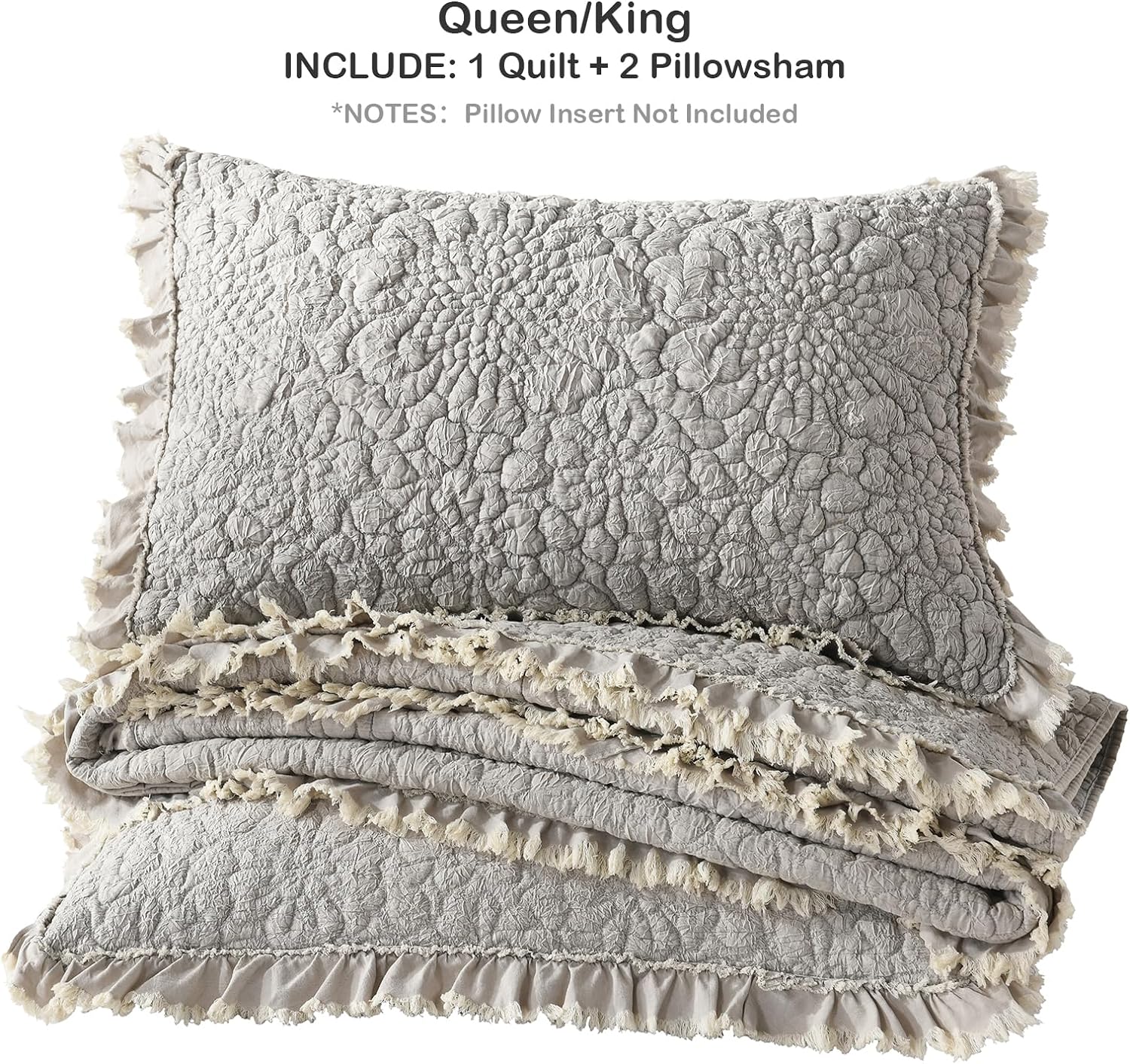 HORIMOTE HOME Beige Ruffled Quilt King Size, Stone-Washed Microfiber Lightweight Crinkled Farmhouse Rustic Shabby Chic Bedding Set, 3 Pieces Reversible Bedspread with Pillow Shams for All Season