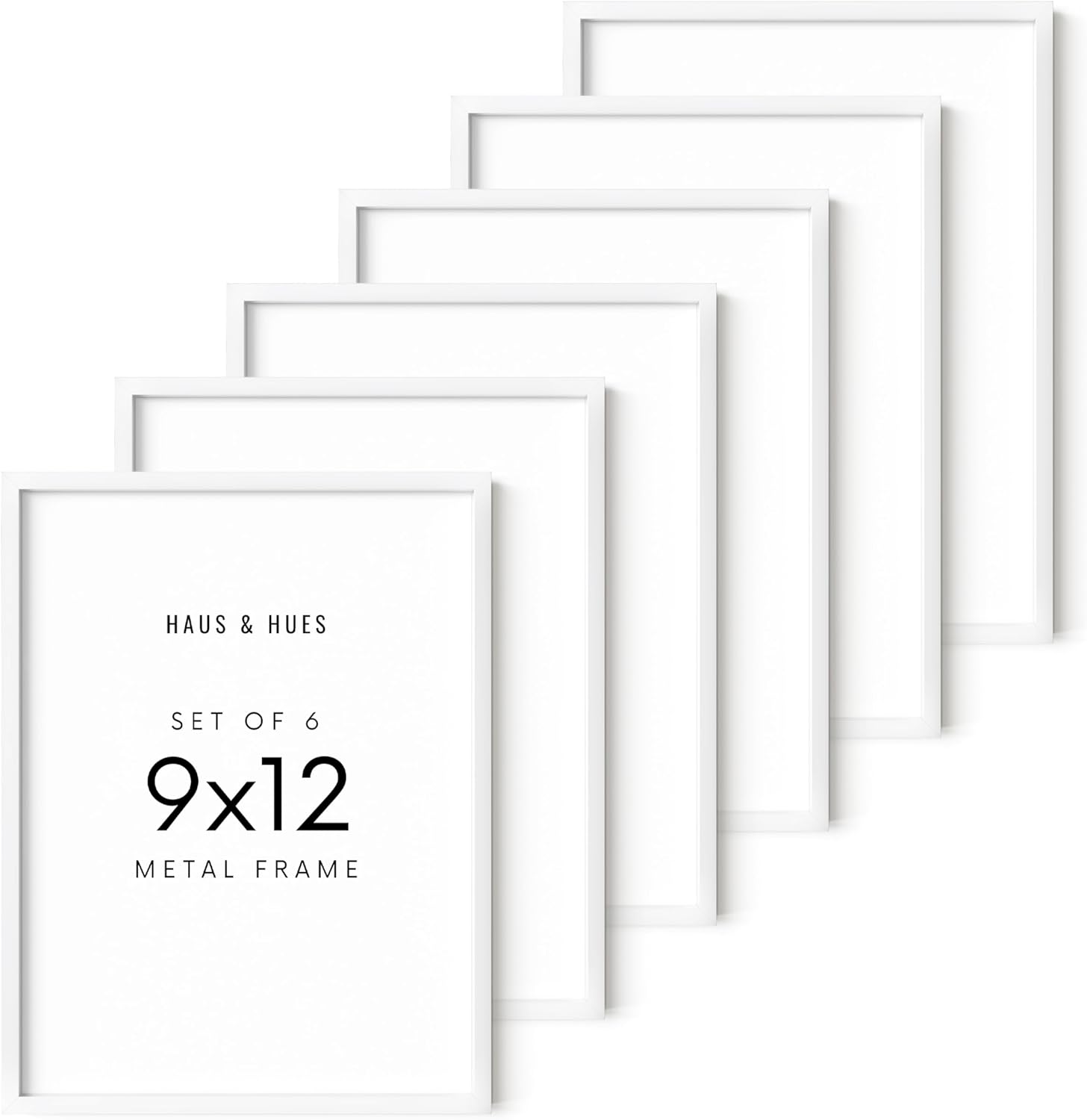 HAUS AND HUES 9x12 White Metal Picture Frames - Features Premium Aluminum, Vertical & Horizontal Hang, Shatterproof Plexiglass - Perfect for Home, Room, Office (9x12 in, White, Set of 6)