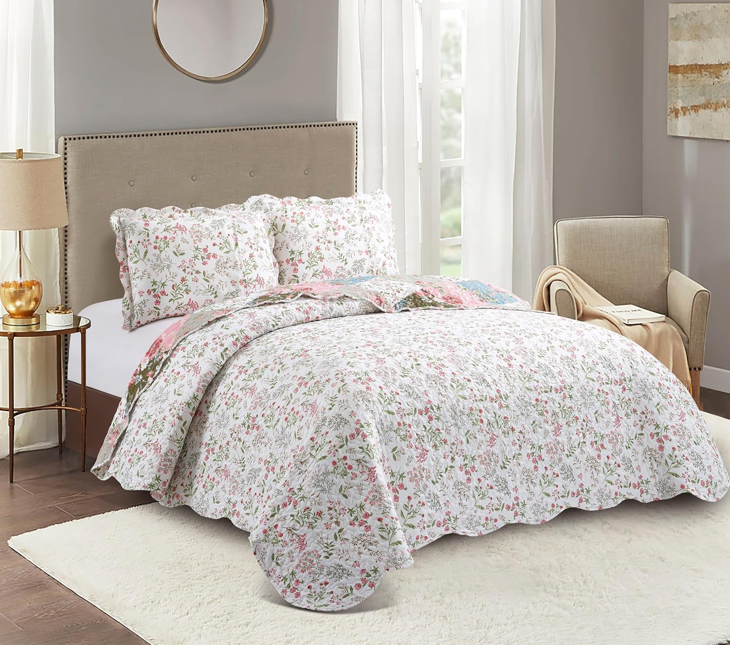 Brilliant Sunshine Peach and Olive Flowers Patchwork, 3-Piece Quilt Set with 2 Shams, Reversible Bedspread, Soft Lightweight Coverlet, All-Season, Full/Queen, Peach Olive