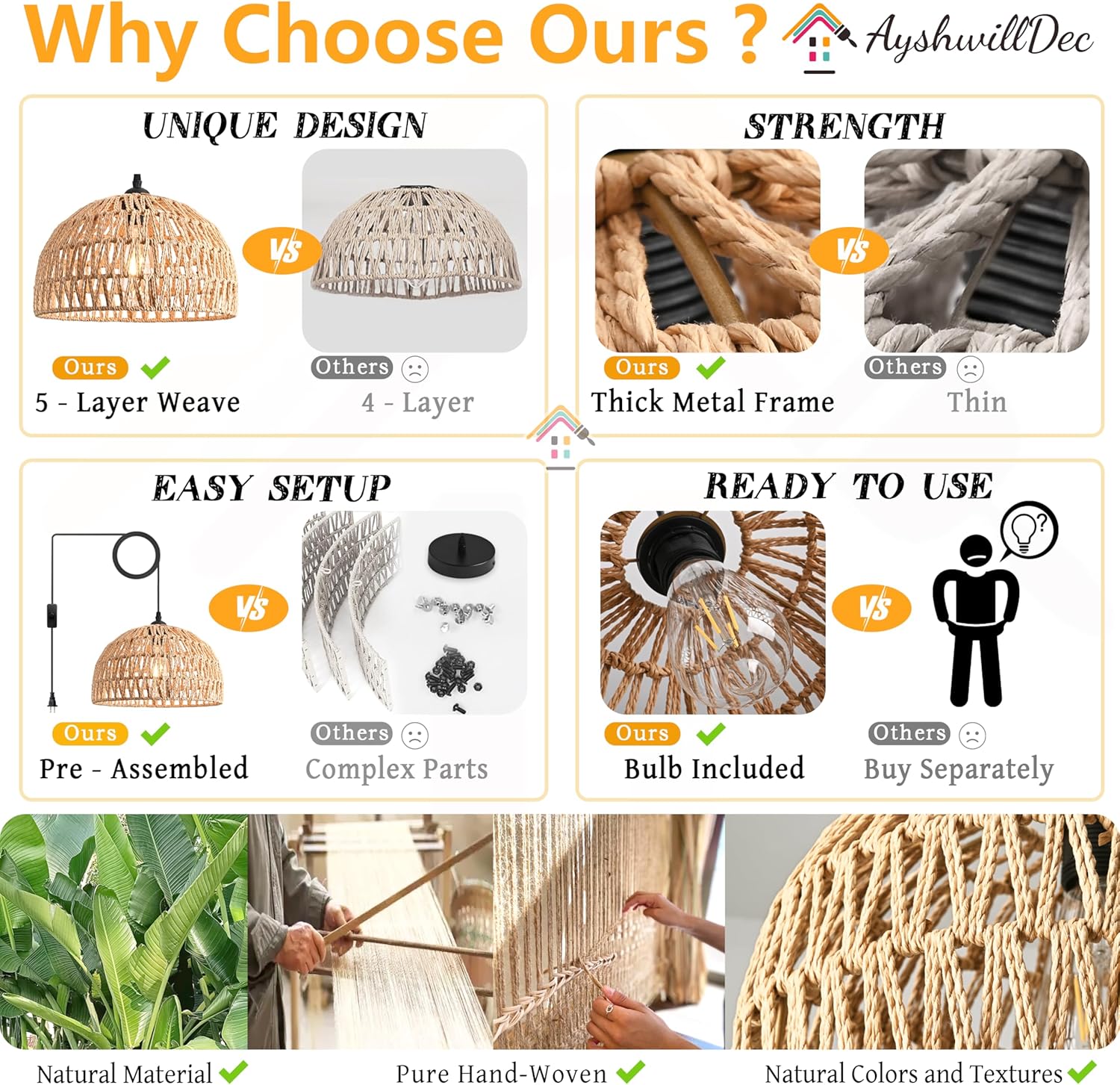 - [Rattan Plug In Pendant Light ]: The brown woven Pendant Light with Plug-in Cord uses a brown twine braided cage and a 15Ft on/off power cord. The light glows softly and pleasingly through the twine, bringing a relaxing and cosy ambience to any corner of your home, giving you a different kind of wow factor.