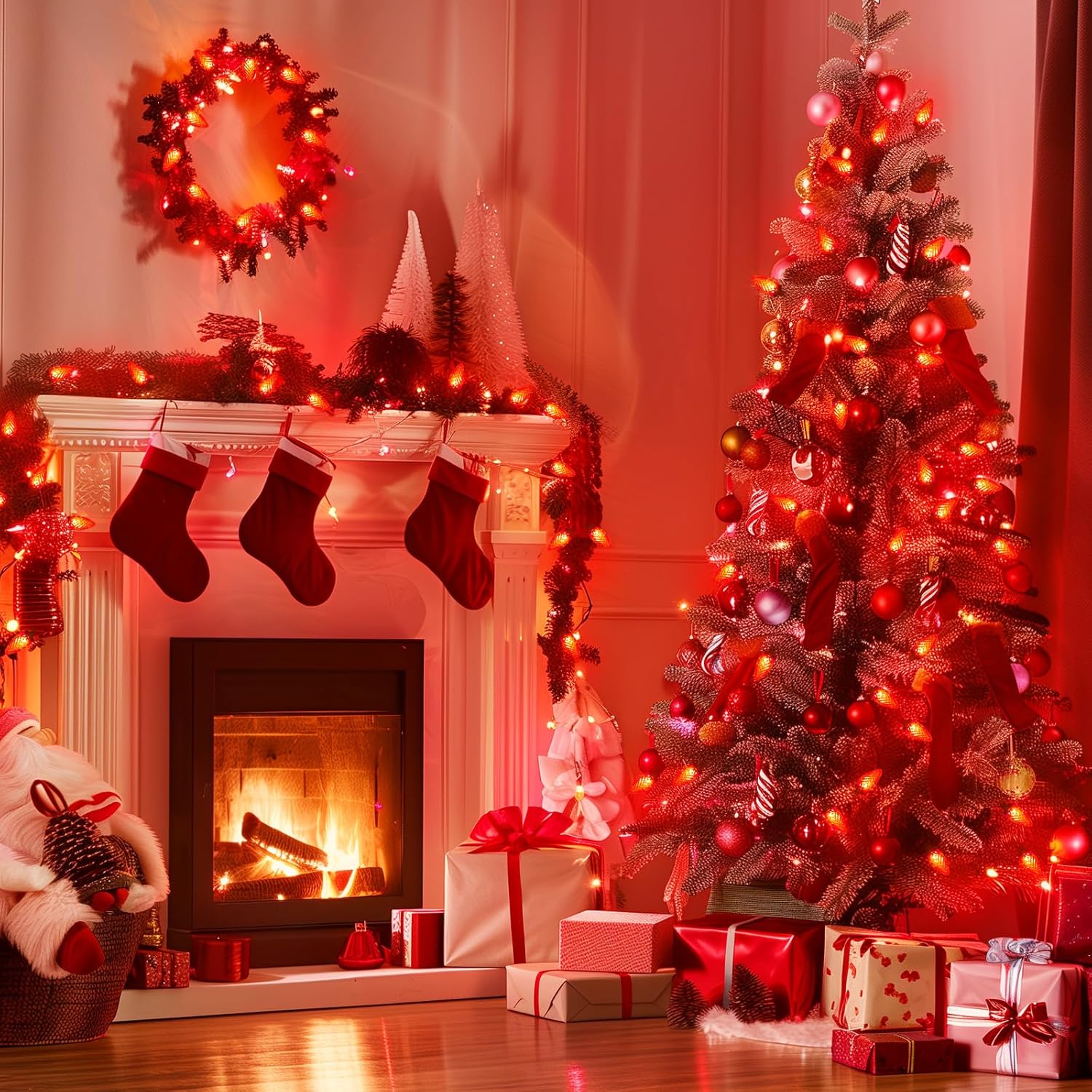 - 50 LED C9 Christmas Lights: The plug-in C9 Christmas lights are 33 feet long and feature 50 bright strawberry-shaped LEDs with 8-inch spacing between each bulb. Green cord is more suitable for Christmas tree decoration, adding a festive and warm atmosphere to your home.