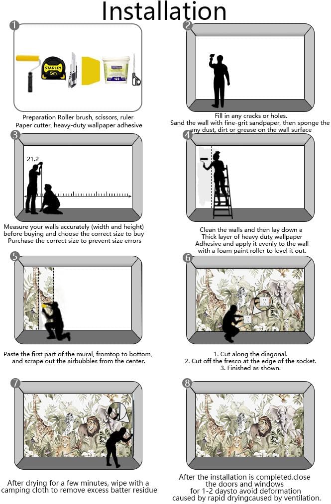 - Installation steps 1. Fill in any cracks or holes and clean the surface of the wall of dust, dirt and grease.2. Apply heavy-duty wallpaper paste to the wall, not the mural.3. Mark the position of each strip of wallpaper with a spirit level.4. Align the pattern and slide it into place.5. Scrape the bubbles with a spatula.6. Let it dry for a couple of minutes and it's ready to go!