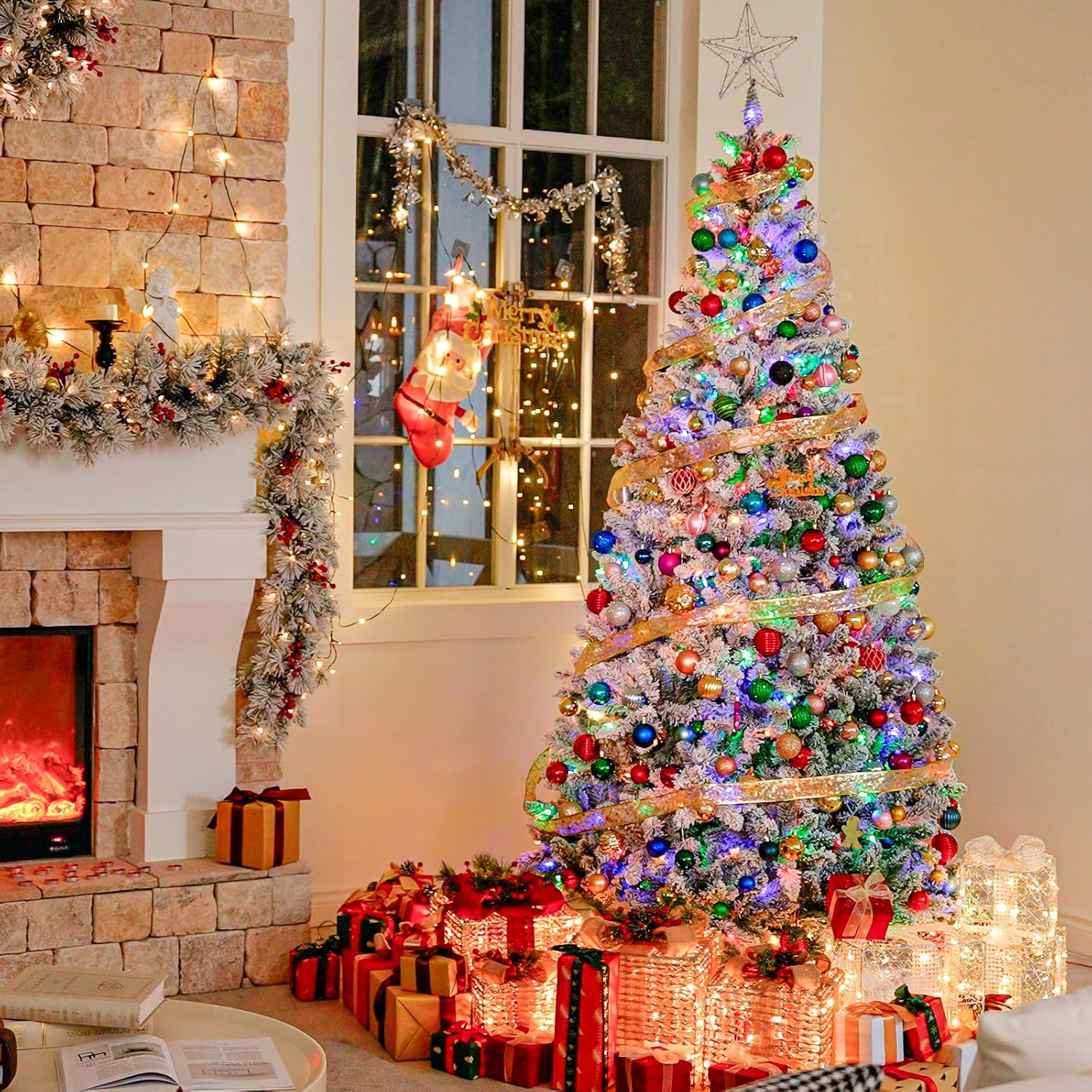 Hykolity 7.5 ft Prelit Snow Flocked Christmas Tree, Artificial Christmas Tree with 450 Color Changing LED Lights, 1446 Branch Tips, Metal Stand and Hinged Branches, 10 Colors