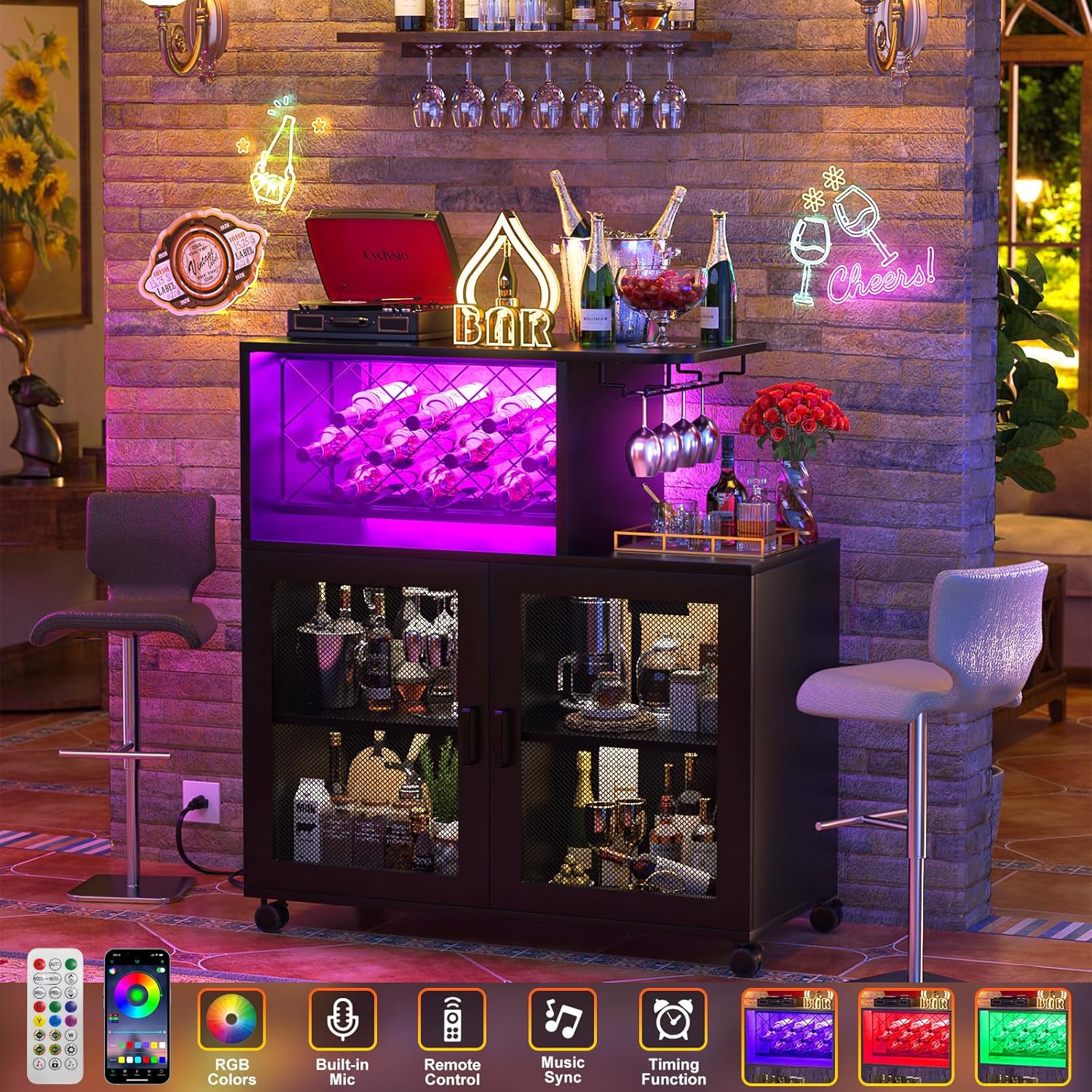 Wine Bar Cabinet with Wheels, Small Liquor Cabinet with LED Light, Home Bar Cart with Power Outlets, Coffee Bar with Wine Rack, Glasses Storage for Kitchen, Dining Room, Living Room, Black