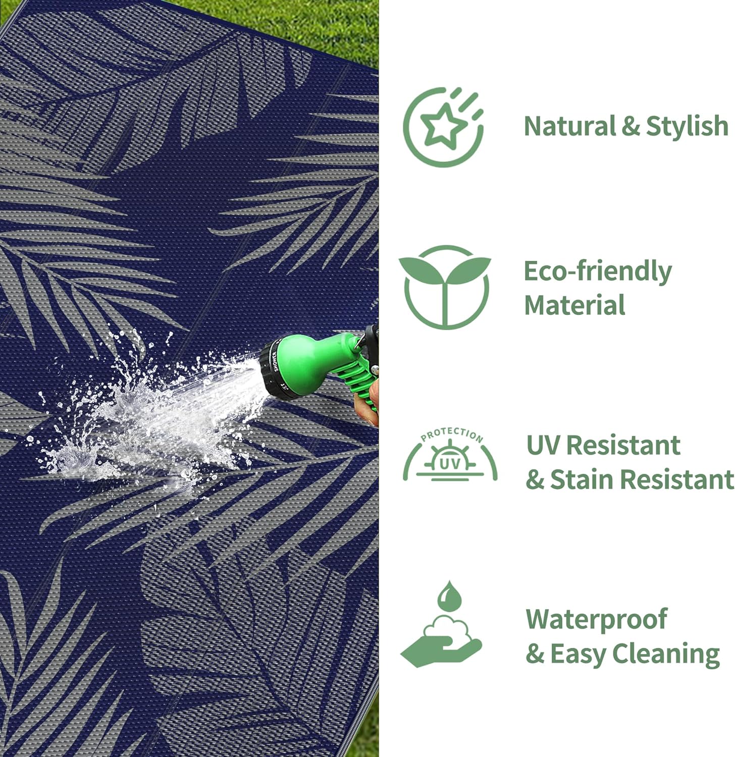 - Waterproof & Easy To Clean: Our indoor and outdoor rugs are waterproof, stain resistant, non-slip, easy to clean and well-breathable. As an outdoor patio rug or picnic mat, you don't have to worry about drink spills, food stains, sand or dirt, just rinse with water or wipe with a damp cloth. Plus, the breathable material allows it to air dry in minutes. You can enjoy your exclusive leisure time with your family or friends outdoors or indoors without any worries