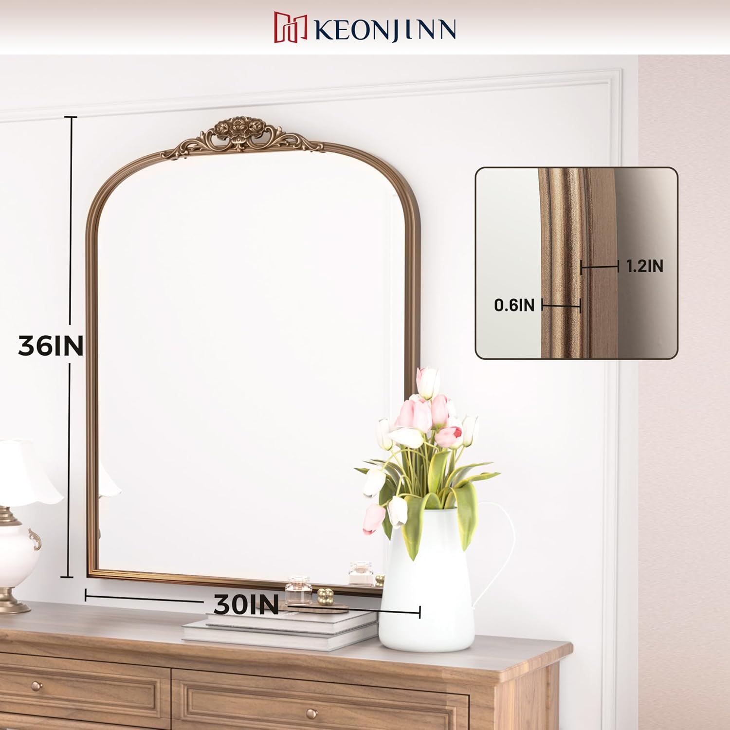 - 【Elevate Your Space with Baroque Grandeur】The Keonjinn Vintage Mirror is a masterpiece of timeless elegance, channeling the lavish artistry of the Baroque era. Its sweeping arched silhouette, adorned with an intricately carved wooden floral crown, transforms walls into canvases of historical opulence. Perfect as a statement centerpiece, this mirror infuses rooms with regal charm and a touch of old-world drama.