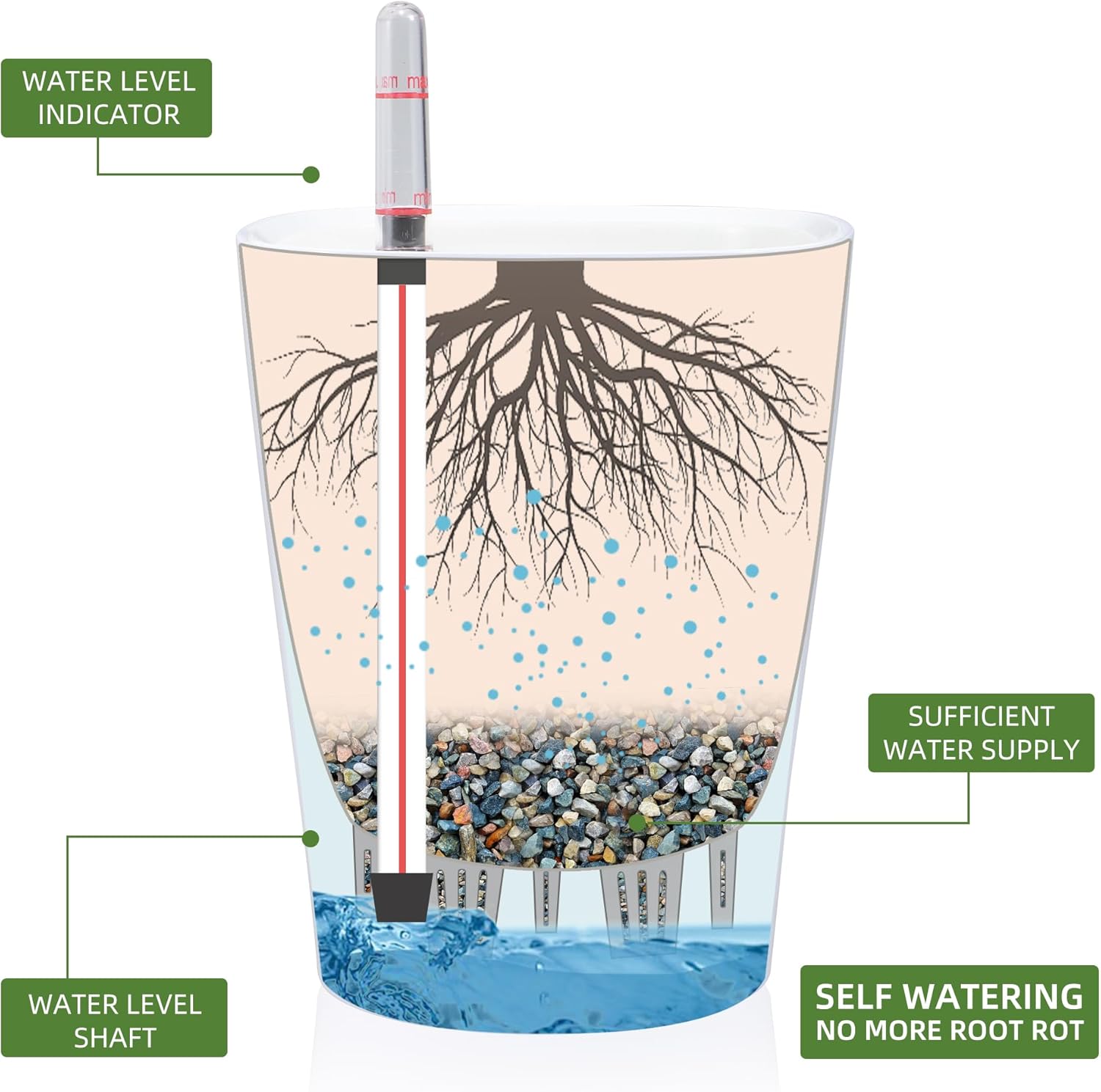 - NEVER MISS WATERING AGAIN - The hydroponic device keeps water ready, then watering time is at your discretion on the gauge. The design of drainage plug and spillway hole is to avoid cycles of overwatering and underwatering, pull out the plug to drain the excess water on rainy days outdoors. The sufficient water supply system enables double the water-efficient than conventional pots. Don't be anxious about missing watering while you enjoy a long term holiday on a journey or travel outside