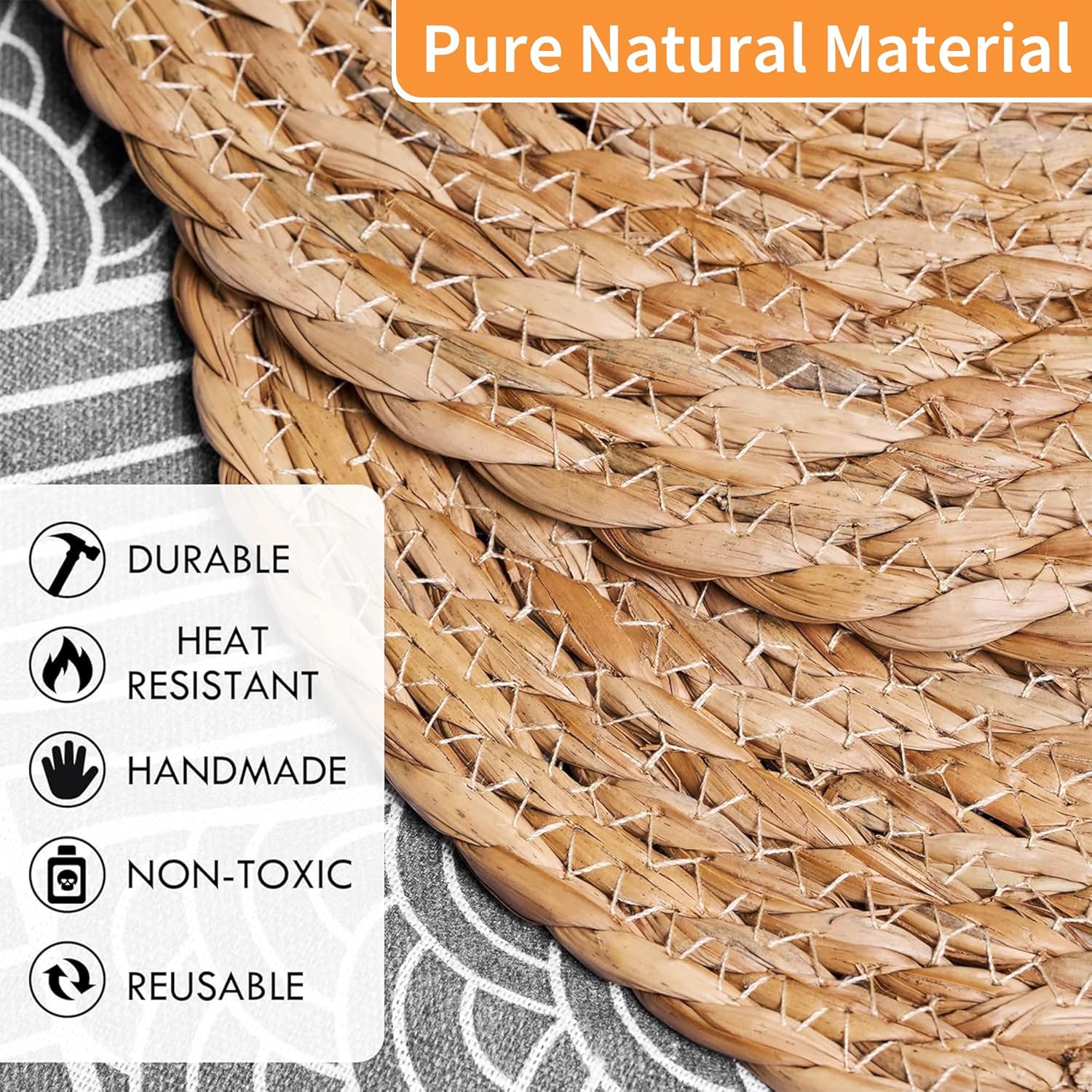 - 【Natural Design&Handcrafted】: Woven Placemats feature a sturdy woven design and round silhouette, This Round Placemats have very tight woven cattail grass (water hyacinth)design and well sewn placemats are carefully handcrafted and made of natural 100% water hyacinth, Easy Cleaning: Simply clean with damp cloth then store in a dry place.