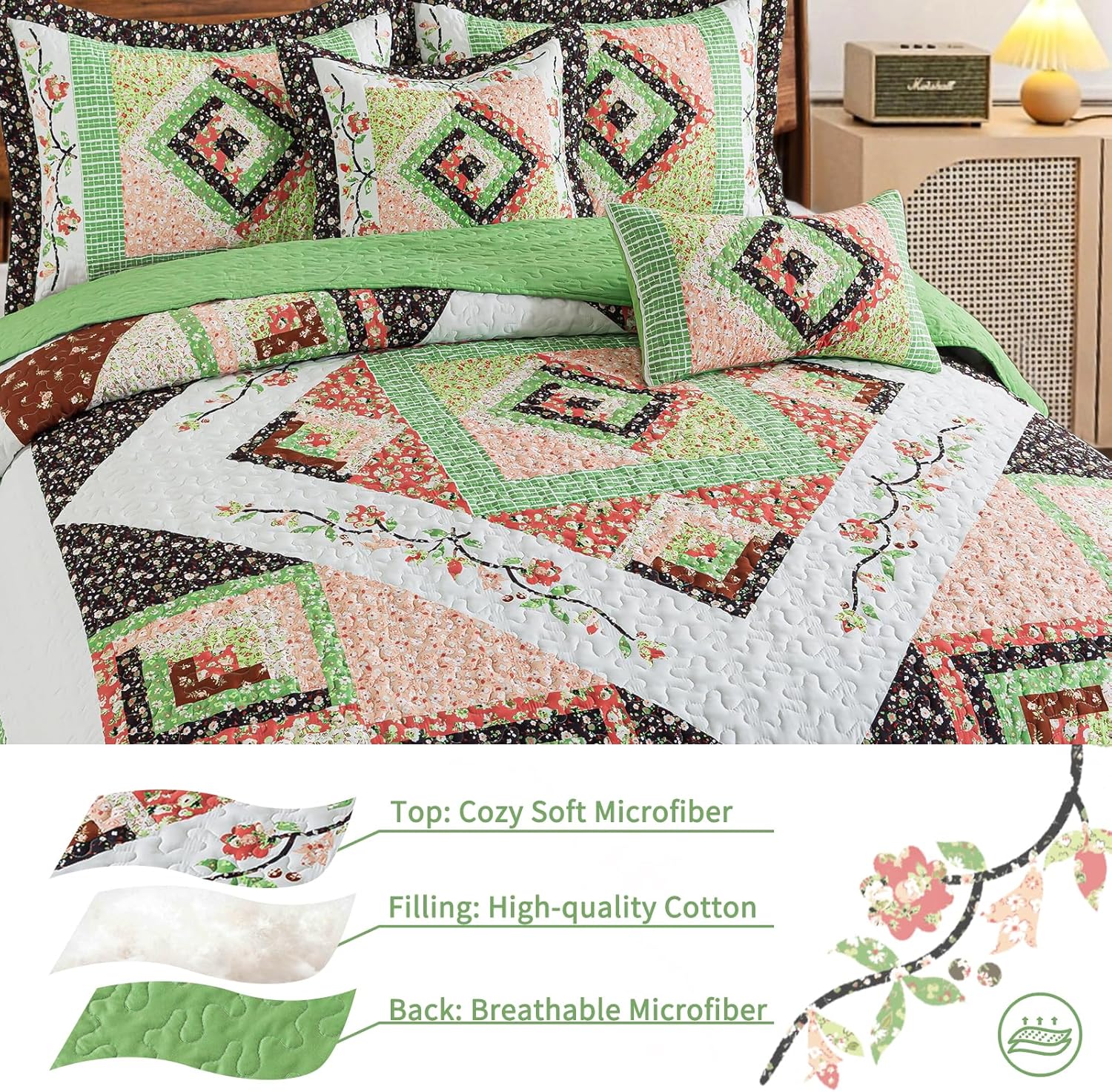 - 【Garden style】 King size quilt set features geometric and floral patterns, combined with green elements, creating a comfortable and fresh natural atmosphere for your bedroom. The soft and comfortable cotton filling allows you to enjoy every peaceful and comfortable night.