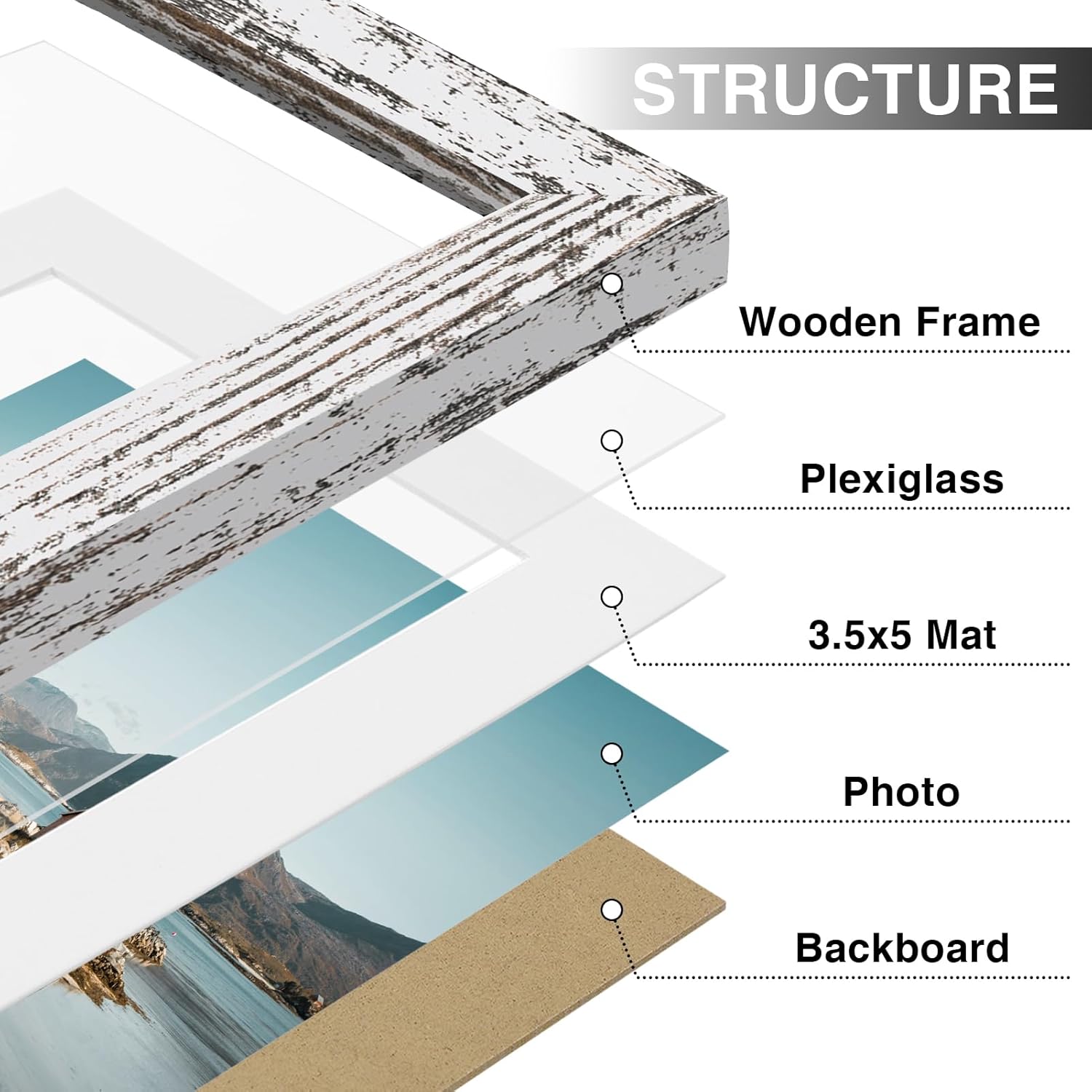 Vittanly 4x6 Picture Frames Set of 9, Shatter Resistant Plexiglass, Display 3.5x5 Pictures with Mat or 4x6 without Mat, Photo Frames for Wall or Tabletop, Engineered Wood, Distressed White