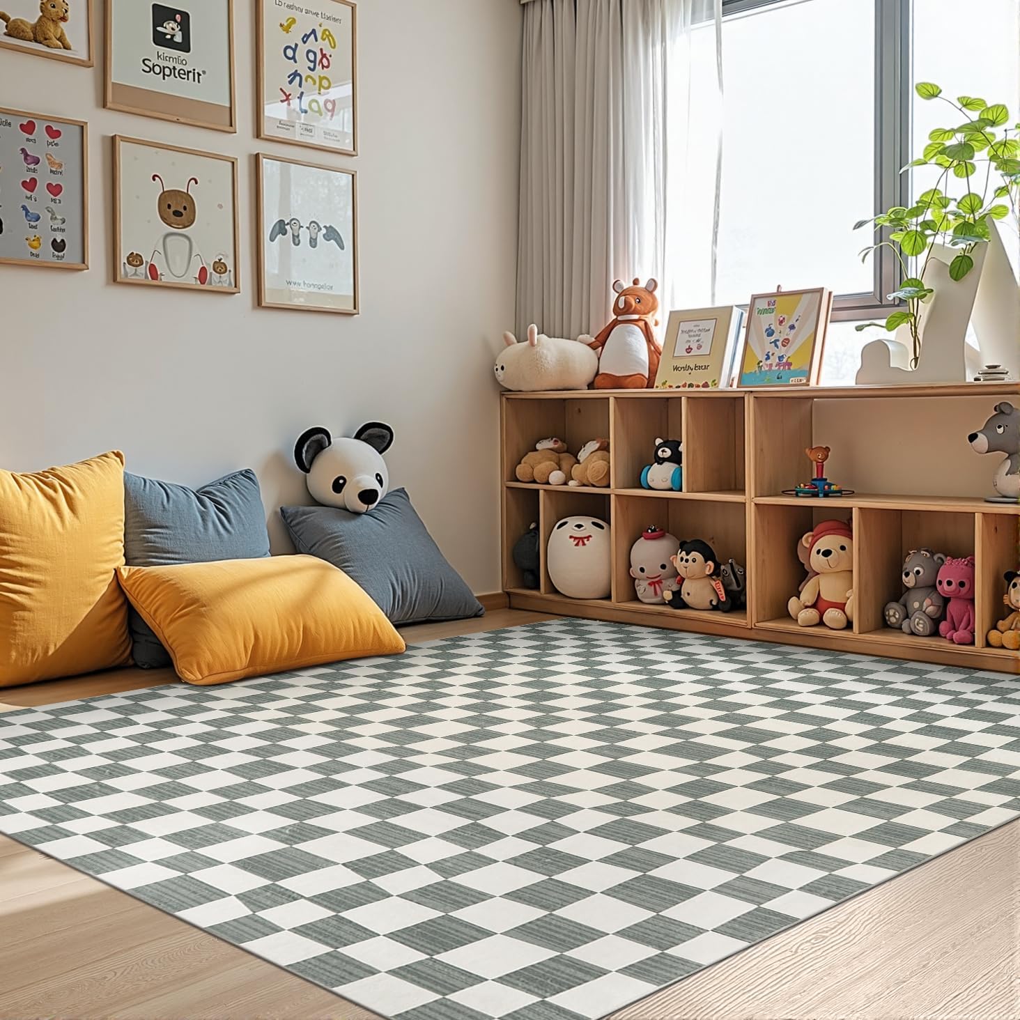 jinchan 4x6 Checkered Area Rugs for Kids Room - Machine Washable Soft Rug Modern Geometric Lattice Non-Slip Carpet for Nursery Playroom Bedroom Entryway Living Room Dining Room Home Office Grey