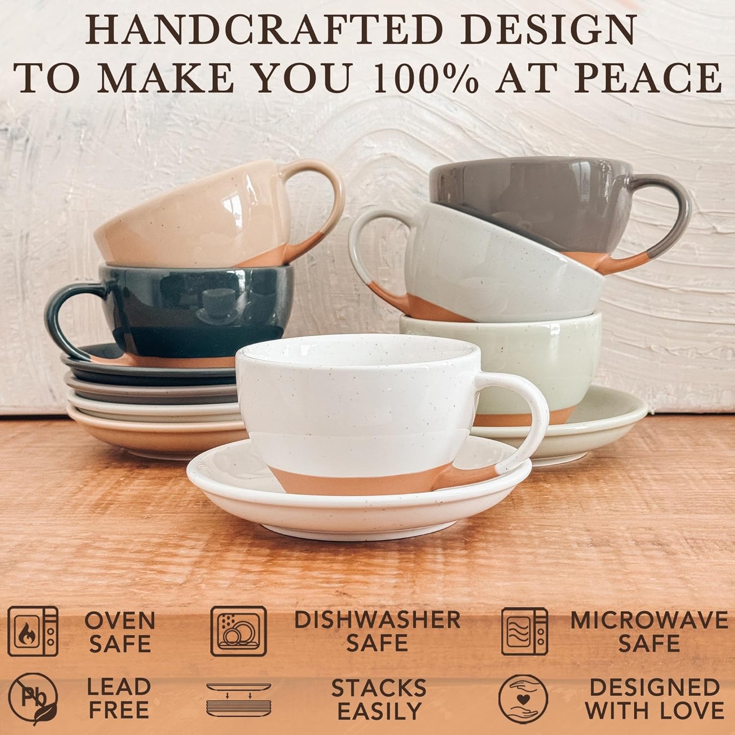 Mora Ceramic Latte Art Mug With Saucer - 10.5 oz, Round Bottom For Perfect Pours - Cafe Cups for Cappuccino, Espresso, Coffee, Tea etc - Porcelain Set for Baristas, Great Gift - Vanilla White