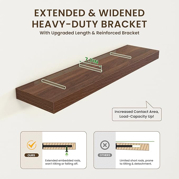 - EASY TO INSTALL - Come with all the installation hardware you need. We have a smart installation design. Thicken metal brackets help boards to be stable and load-bearing, vertical to the wall, and not sagging. The shelves have pre-drilled holes in the bottom to allow screws to secure the boards to the brackets to prevent them from slipping