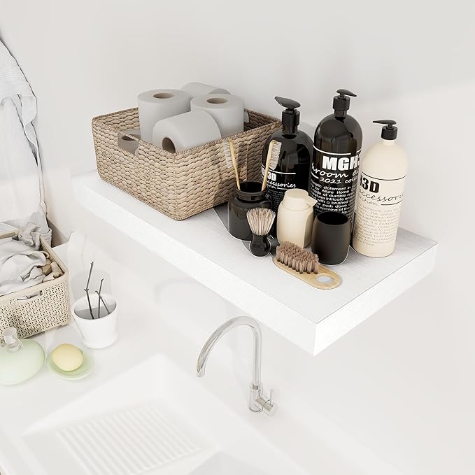 - 【DECORATIVE & FUNCTIONAL】The wall-mounted floating shelves are designed for decoration and storage, utilizing and decorating any space in your home. Used as shelf decor to show your collection, books, or prize, the hanging shelves are perfect for displaying your photo frame, small plants, model, or audio in your living room, office, study. And can also use as over the toilet storage shelf in the bathroom to hold toiletries or used as kitchen shelf to storage condiments.