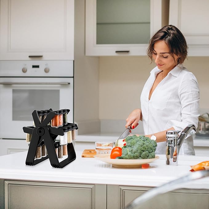 - 【Design】Our spice rack adopts a unique Ferris wheel design. The 360° rotation function of the Ferris wheel design keeps your spices organized and easy to access.