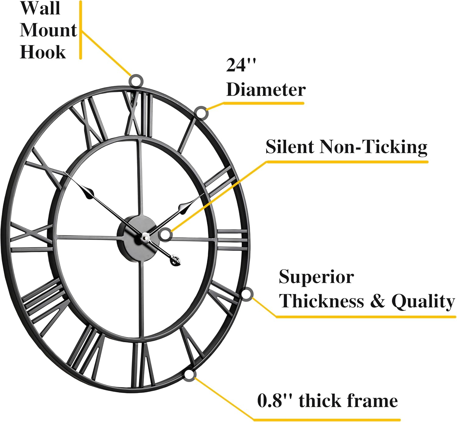 CLXEAST Silent 24 Inch Wall Clocks for Living Room Decor, Large Black Metal Roman Numeral Wall Clocks for Modern Farmhouse Home Decor,House Warming Gifts New Home