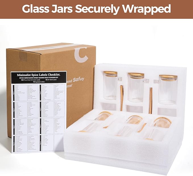 - Comprehensive Package: You'll receive a set of 12 spice jars with bamboo lids and spoons, each boasting a capacity of 8 fl.oz and measuring 4 x 2.5 inches. But that's not all β we've also included oil and water-proof labels, along with 184 pre-printed spice label stickers, 16 writable pantry labels, and 75 expiry date labels.