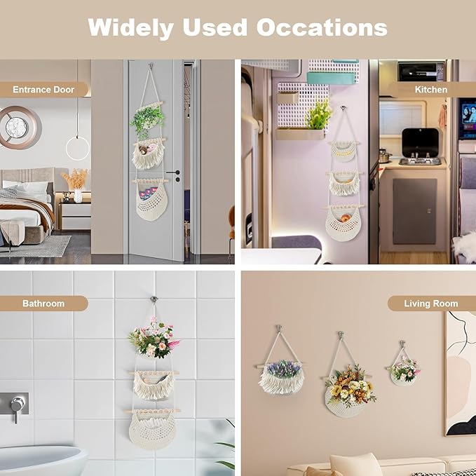 - 【Boho Style Decorative Versatile Storage】Beyond practical kitchen storage, these crocheted over the door storage with macrame in Boho style also serve as stylish rustic decor pieces. You can use it to store produce, fruit, onions, garlic, potatoes in the kitchen, organize scarves, sunglasses and stockings inside the closet, store hair dryer, towels and wash supplies behind the door, or display plant and decorations in living room.