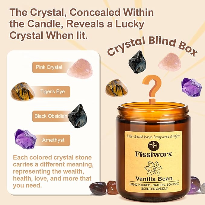- 🌳Natural Soy Wax With Lucky Stone - Enjoy up to 60 hours of continuous burn time , proudly made with 100% natural soy wax that burns evenly. Our fragrances are paraben-free, phthalate-free, and never tested on animals. Fissiworx scents gently enhance spaces rather than overpower them, ideal for those sensitive to scents.(Our soy wax candles contain a random lucky stone that can bring good fortune to everyone. Additionally, it will not burn nor pose any danger).
