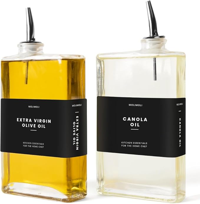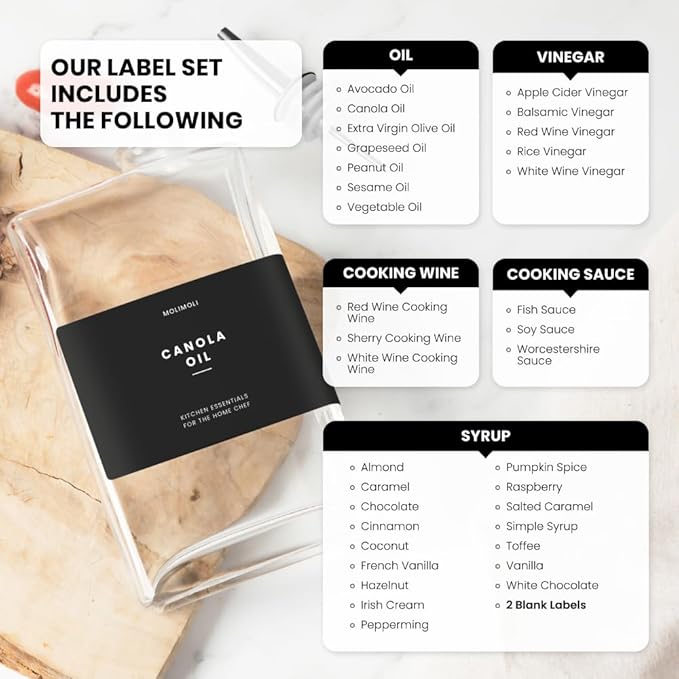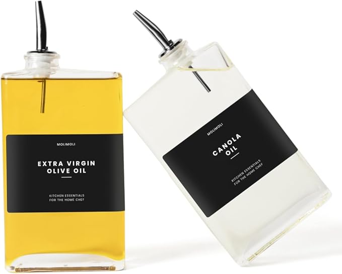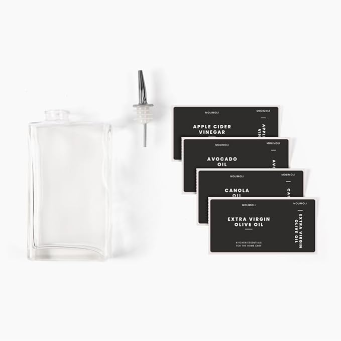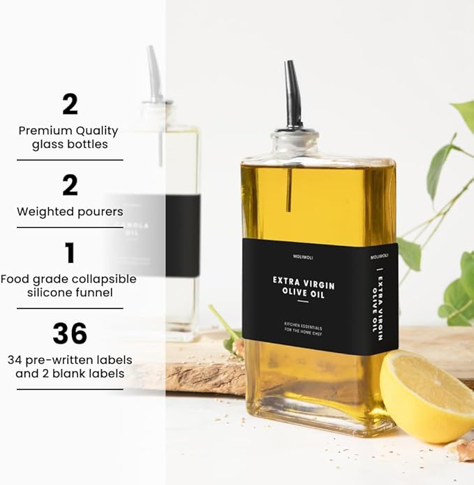 - Modern Kitchen Essential: Minimalism Inspired Cooking Oil Dispenser Bottle. This Set Includes Two High-quality 11.8 Oz (350 Ml) Glass Bottles, Two Gold Pourers, a funnel, and a 37 Label Set.