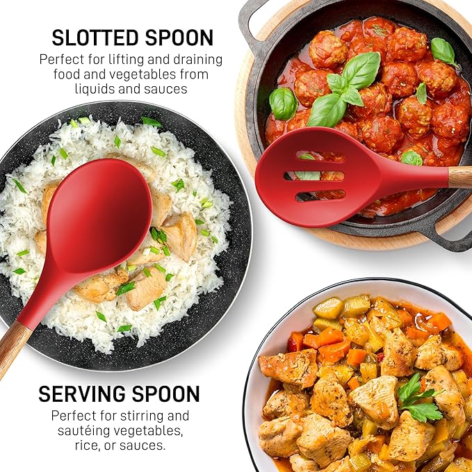 Zulay Kitchen Utensils Set Non-Stick Silicone Cooking Utensils Set with Authentic Acacia Wood Handles - 5 Piece Silicone Utensil Set - Silicone Kitchen Utensils Set with 464°F Heat Resistance - Red