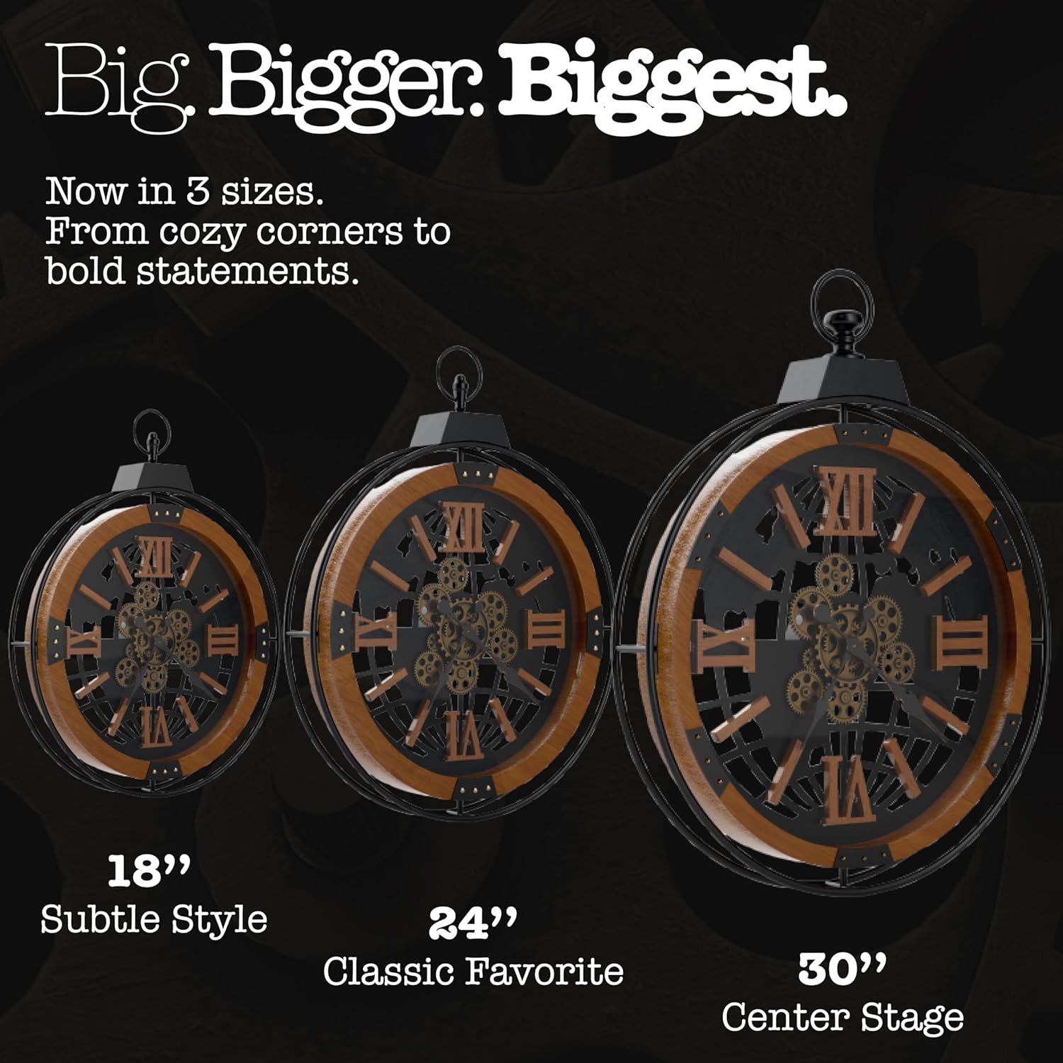 - TIMELESS STYLE: Stay on schedule with your new Driini Large Rustic Wall Clock. This oversized, 24 inch moving gear wall clock features a premium wooden frame, and a decorative black wrought-iron skeleton. The clock face is protected by a HD tempered glass for clear visibility and durability. A big, looped handle on top adds to its aesthetic as an industrial steampunk clock or gothic clock, while also invoking nautical and farmhouse vibes. Hand-cut 3D solid wood Roman numerals and tick marks are individually mounted to ensure visibility from any angle.