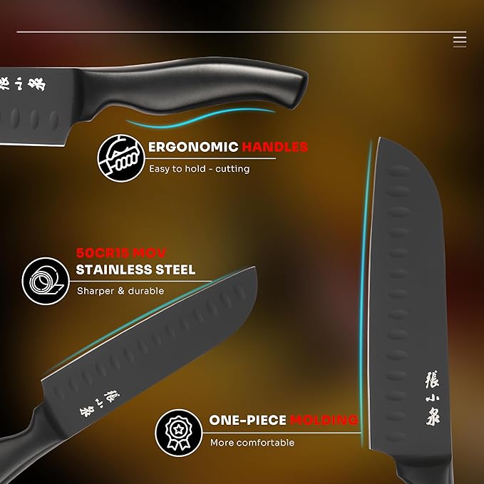 - 【OUSTANDING PERFORMANCE】: This knife block set uses 50cr15 mov stainless steel which is very sharper and durable, the stainless steel surface is coated with CVD black coating, which is more rust-resistant and beautiful than ordinary styles.It can be used at high frequency or after long periods of inactivity.