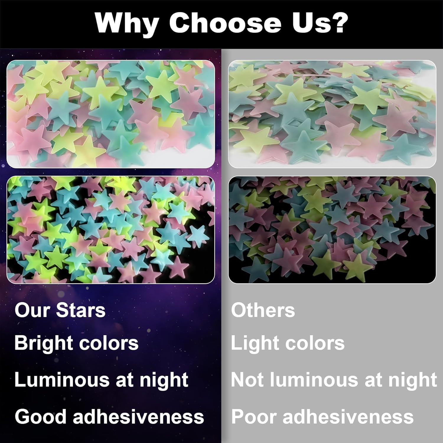 - What you will get:200 mixed-color night light stars, two stickers, and a free luminous moon. ใTipsใFor best results, avoid installing on textured walls, rough concrete, limewash walls, as the sticker may not stick as expected. Clean the wall before pasting to achieve better pasting effect. The pink and blue stars are decorative during the day and emit a faint fluorescent green effect at night, which may not be as bright as the green stars.