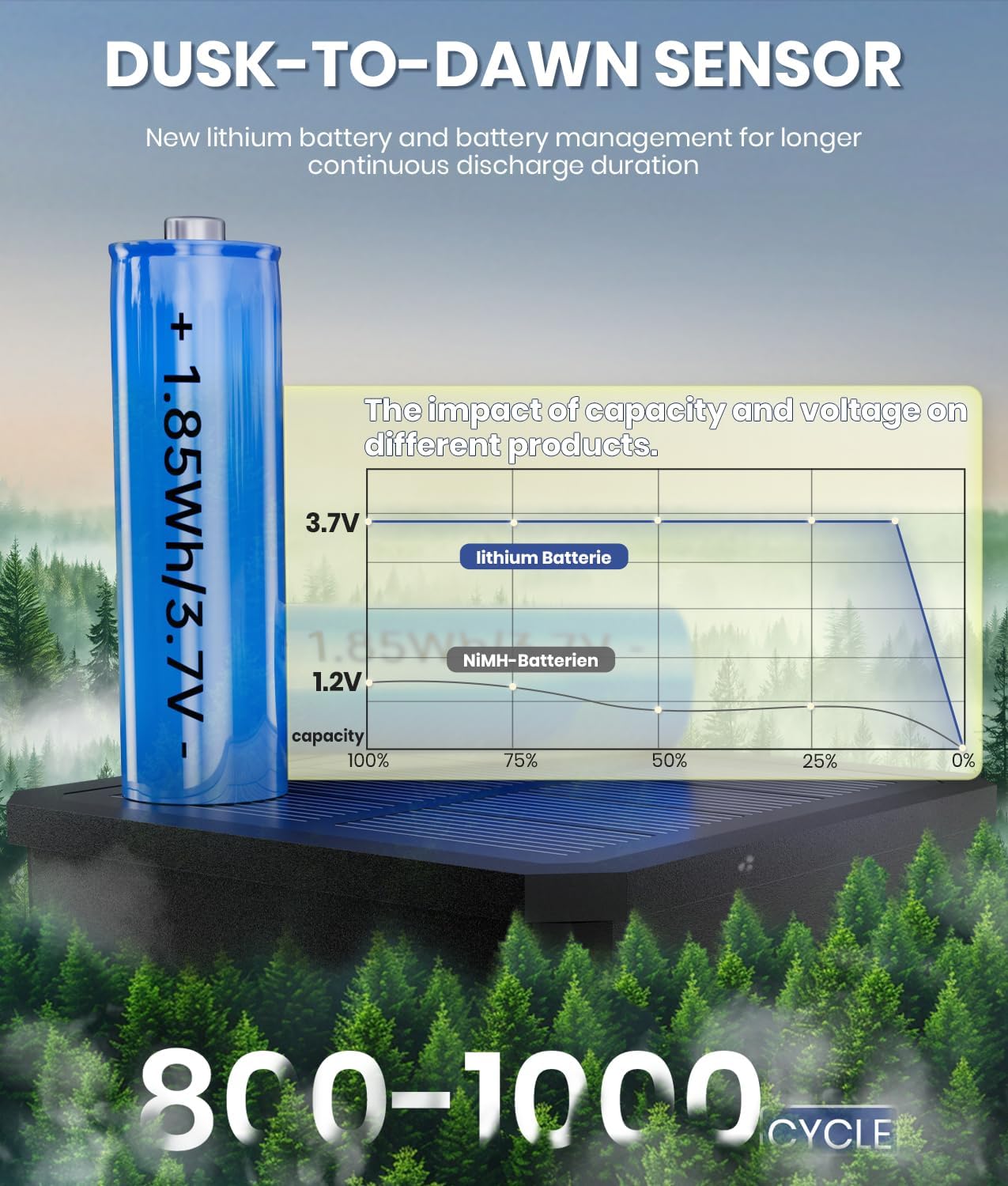 - 💡【2025 Upgraded Solar Panel & LONG-LASTING Lighting】Solar pathway lights outdoor are equipped with 5V monocrystalline silicon solar panels with 26% higher conversion rate, 800 mAh rechargeable Ni-MH battery.The solar powered landscape lights can illuminate for 10 -12 hours on a 4-6 hour sun day charging. Compared with other solar lights outdoor waterproof, our solar lights outdoor charge faster and work longer.