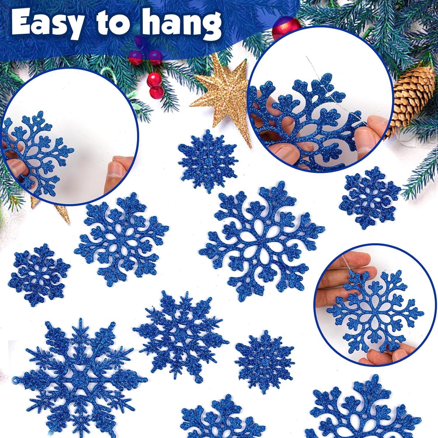 - DESIGNED TO HANG: Big Christmas snowflake ornaments have hole at top for easy hanging except some that are only with the hollow design but they're also able to be hung easily with the string. included.