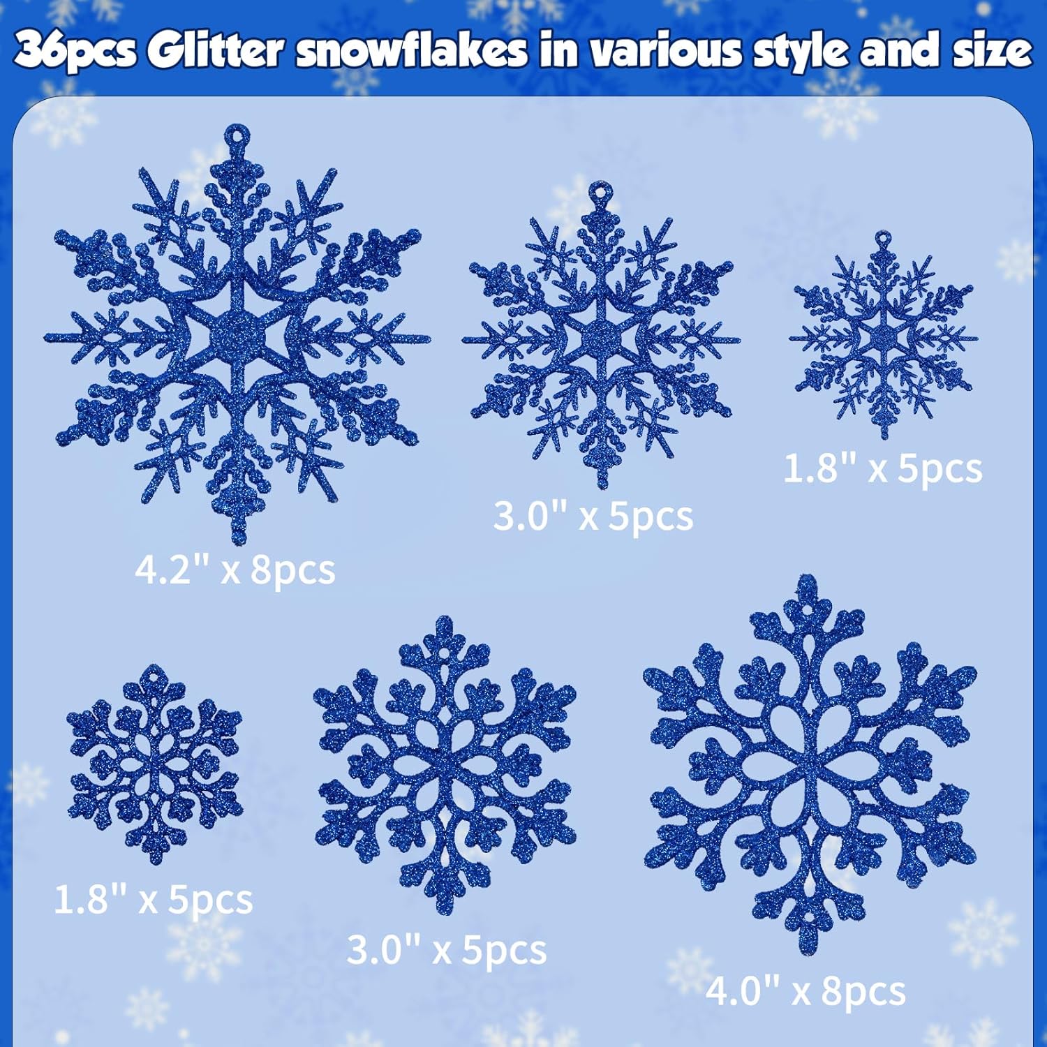 - SNOWFLAKES OF VARIED SIZES: A value pack of 36pcs navy blue Christmas glitter snowflakes in 4 varied sizes and 2 different patterns: 8pcs for 4.2 inch, 8pcs for 4 inch, 10pcs for 3 inch for both styles and 10pcs for 1.8 inch for both styles. Itโs a lot of snowflakes sufficient for your Christmas decorations.