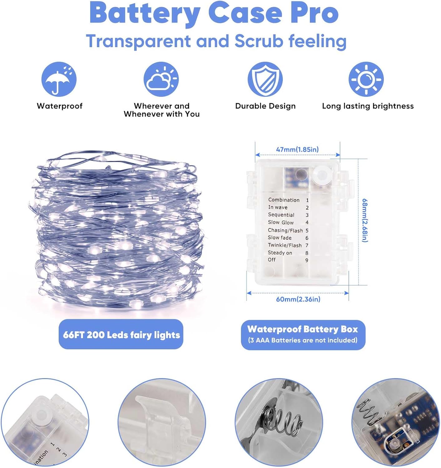 2 Pack 65.6 Ft. Battery Operated Outdoor String Lights with Remote & Timer, LED Cool Whit Fairy Lights, Waterproof Twinkle Lights for Bedroom, Dorm, Mason Jar, Wedding, Party, Christmas
