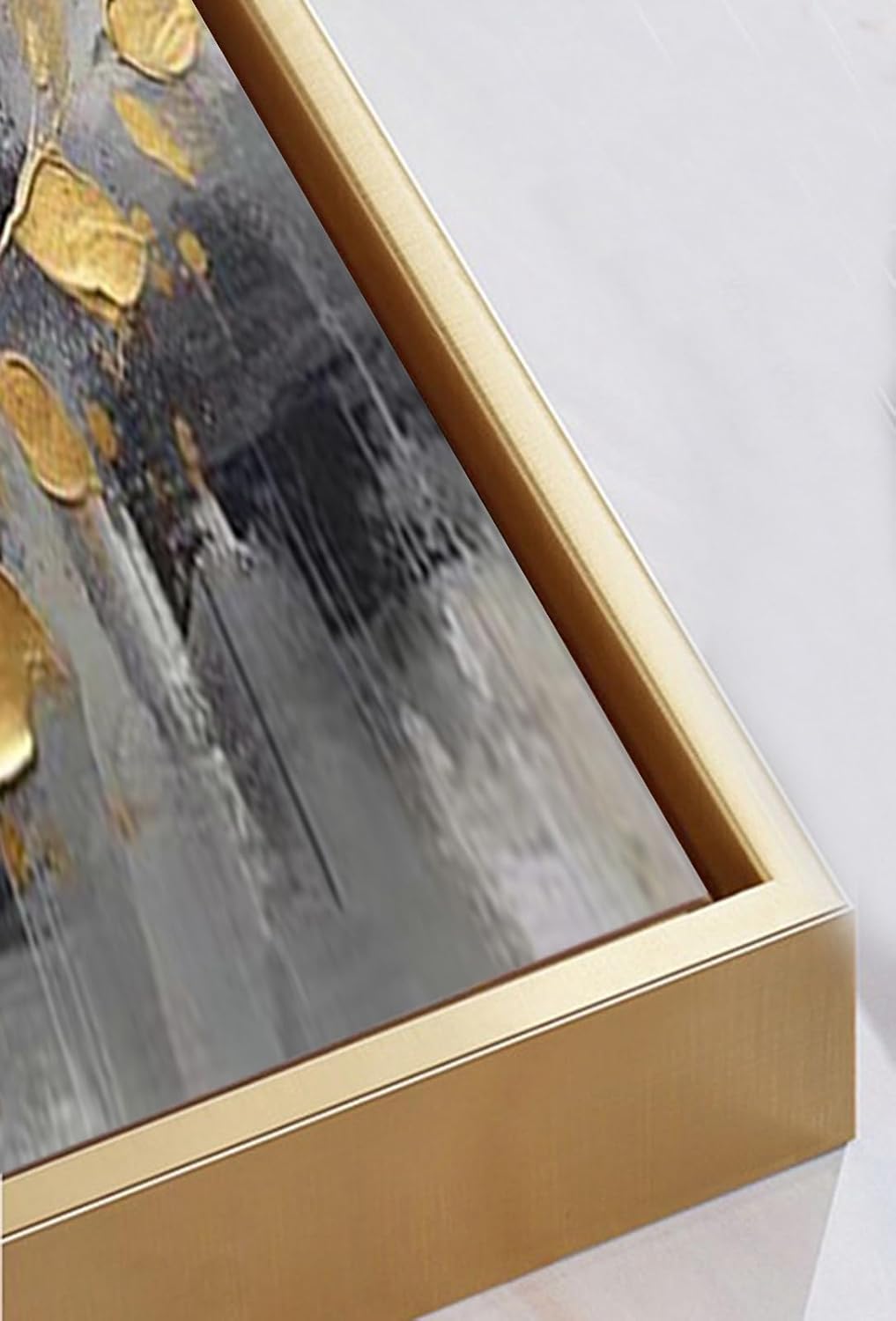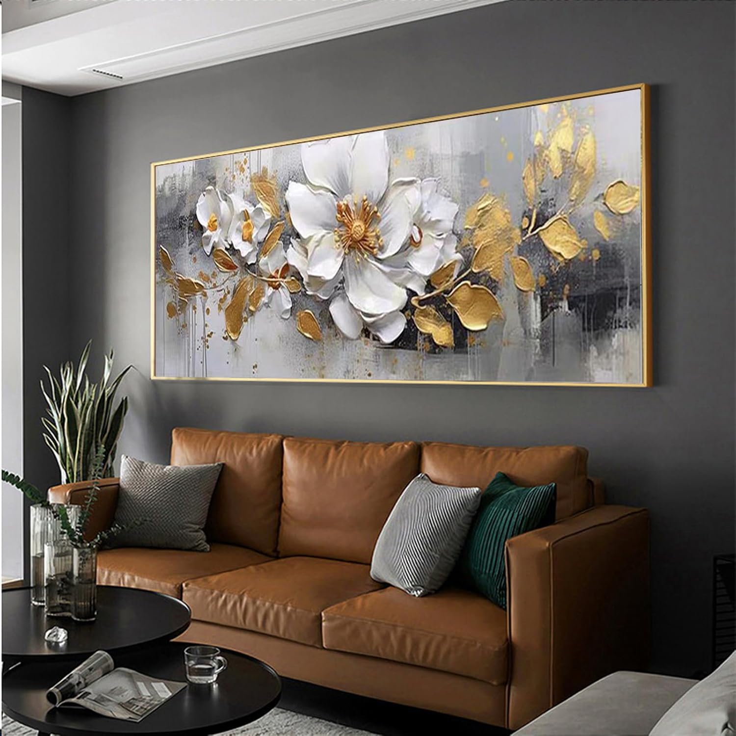 White Flower and Golden Leaf Wall Art for Living Room Hand Painted Floral Oil Painting on Canvas for Bedroom,Large Framed Artwork for Office Kitchen Wall Decor 24x56inch
