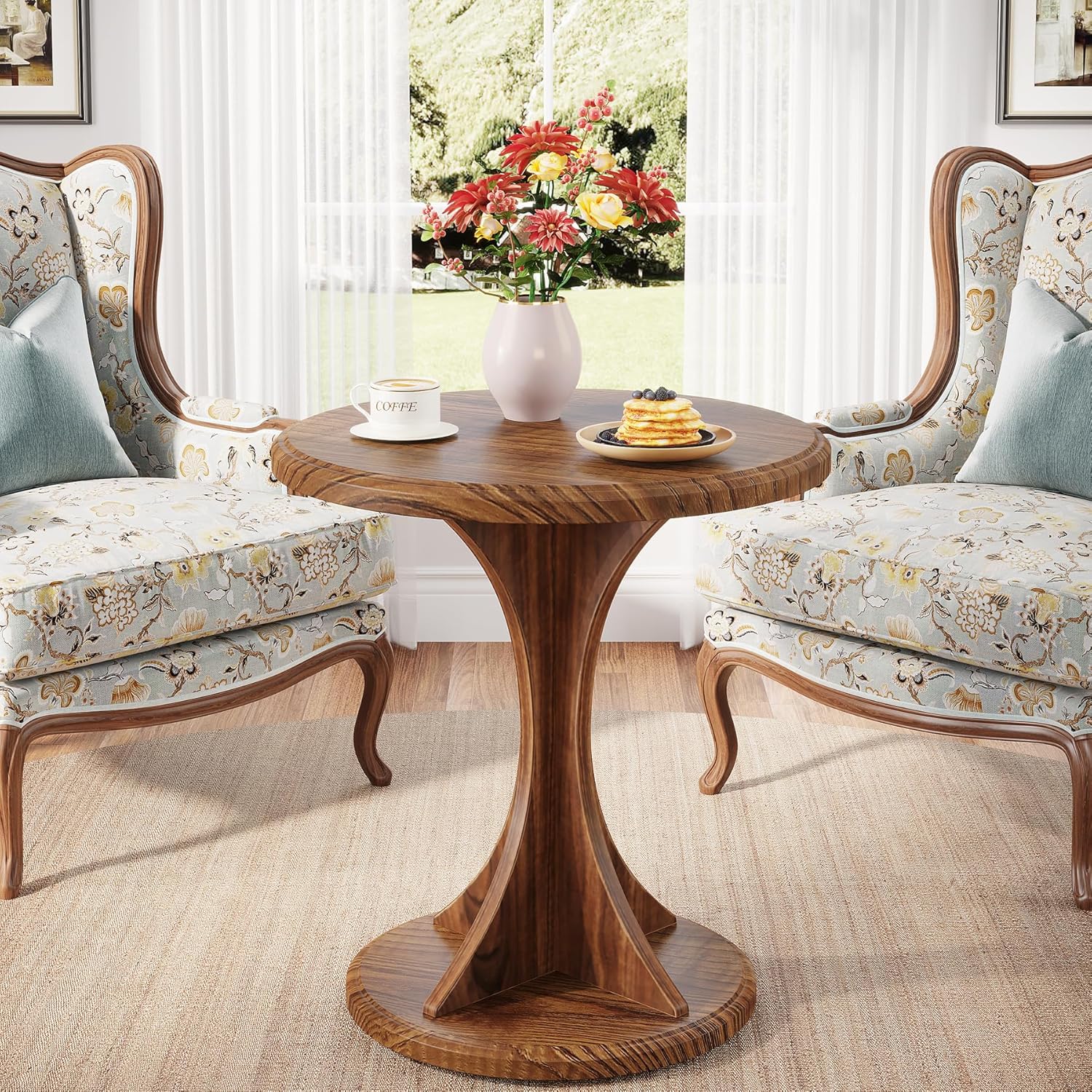 - Vintage Appearance: Its classic round design pairs a rustic brown tabletop with an hourglass-shaped pedestal. The natural wood texture enhances its aesthetic appeal, infusing depth and charm into your room. This side table not only serves as a functional piece but also sparks creativity in home decor, making it a striking addition to any space