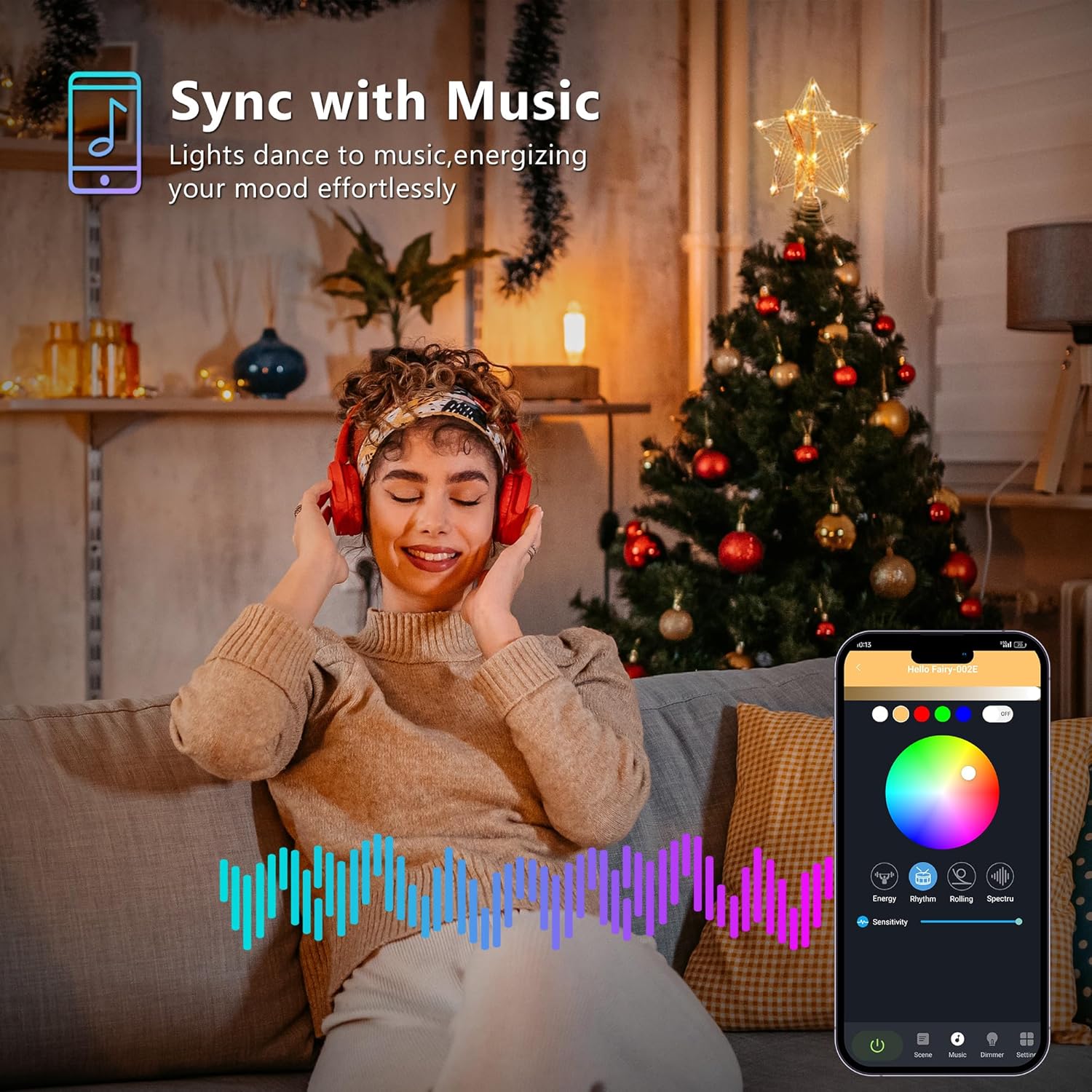 - Sync with Music & Group Control: Enhance your holiday festivities with built-in rhythms. Choose from four types—Energy, Rhythm, Rolling, and Spectrum—to sync your smart tree topper lights with your favorite songs, adding a dynamic element to your celebrations. Group manage your color changing tree toppers—adjust colors, brightness, speed, or choose pre-set scenes effortlessly, simple to coordinate your entire holiday display for a cohesive and stunning effect.