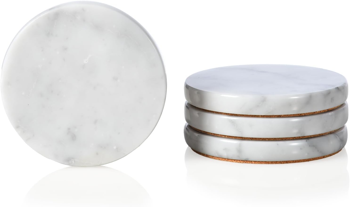 - Simple and Practical: Including 4 pieces of natural carrara white stoneware coasters (size: Ξ¦4'' x H0.4'') , the drink accessory set is a good size for all kinds of glasses, teacups and mugs, which can hold hot and cold drinks without worry. Classic round design, practical and stylish, perfect for kitchen, living room, bar, hotel, restaurant, party and so on