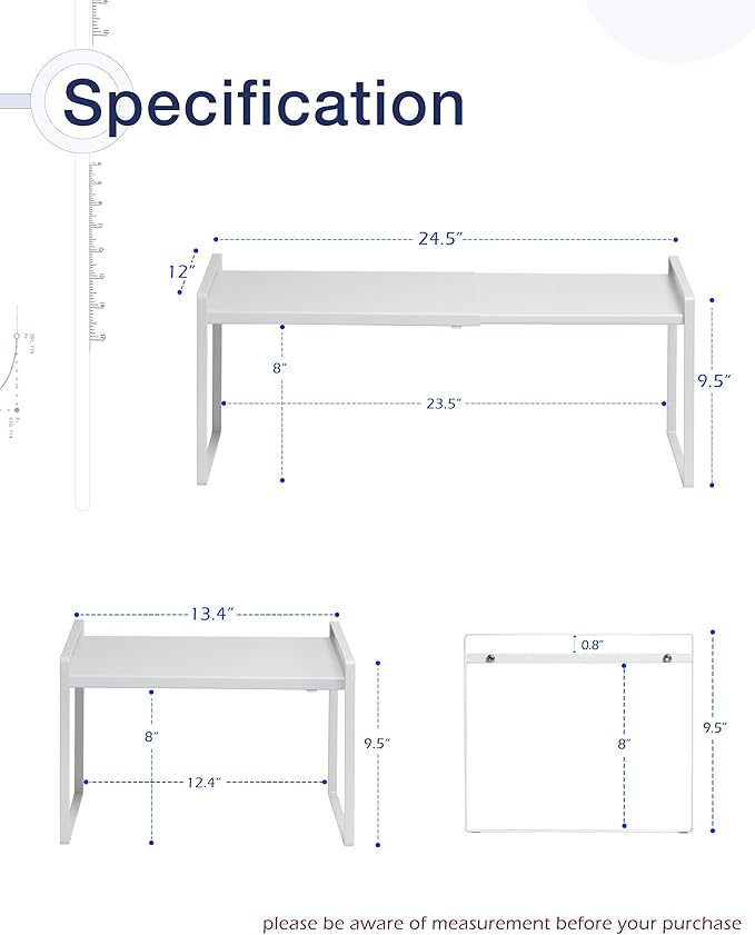 - EXPANDABLE: You may expand the width of this freestanding cabinet shelf to your desires. It can easily vary from 13.4 inches to 24.5 inches in width depending on how you want to organize your space. Specification: 12’’D * 13.4-24.5’’W * 9.5’’H