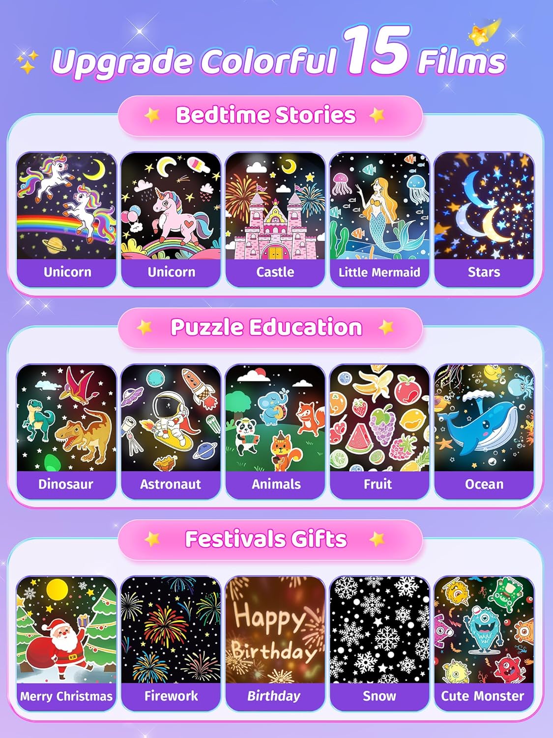 - 🎀15 FILMS STAR PROJECTOR FOR KIDS: The star projector for kids/ star night light projector has 3 THEMES & 15 FILMS: Bedtime Story, Puzzle Education, Festival Gifts: Starry Sky, Unicorn, Mermaid, Birthday, Dinosaur, Astronaut... Star projector for kids is clear that kids can pointing out all the animals on the wall. Kids night light projector shines in the dark, create a bright world that activates kid's imagination & helps them sleep.Kids feel like they are in the universe looking at the stars! Girls can change the star projector for kids, star night light projector, star lights for ceiling to their fav film, and have a different bedtime experience to enjoy sweet dreams~